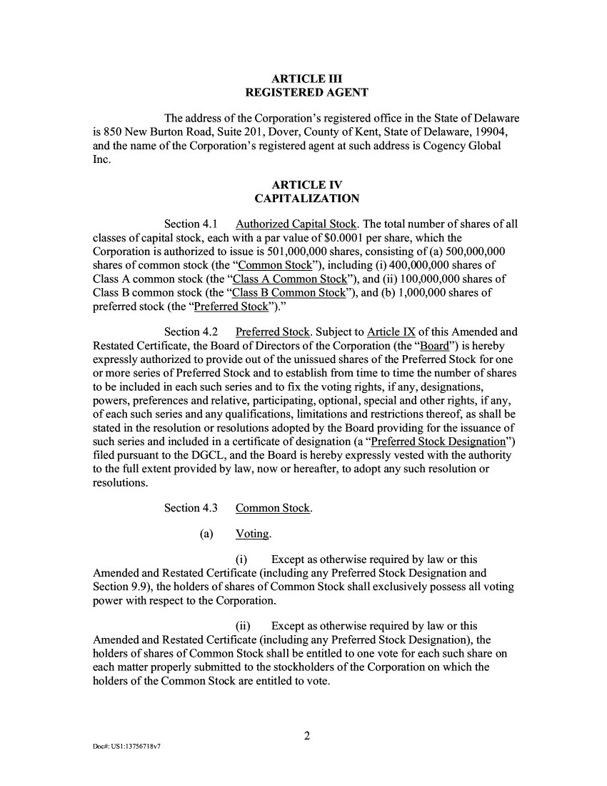 ARTICLE III REGISTERED AGENT The address of the Corporation's registered office in the State of Delaware is 850 New Burton Road, Suite 201, Dover, County of Kent, State of Delaware, 19904, and the name of the Corporation's registered agent at such address is Cogency Global Inc. ARTICLE IV CAPITALIZATION Section 4.1 Authorized Capital Stock. The total number of shares of all classes of capital stock, each with a par value of $0.0001 per share, which the Corporation is authorized to issue is 501,000,000 shares, consisting of (a) 500,000,000 shares of common stock (the "Common Stock"), including (i) 400,000,000 shares of Class A common stock (the "Class A Common Stock"), and (ii) 100,000,000 shares of Class B common stock (the "Class B Common Stock"), and (b) 1,000,000 shares of preferred stock (the "Preferred Stock")." Section 4.2 Preferred Stock. Subject to Article a of this Amended and Restated Certificate, the Board of Directors of the Corporation (the "Board") is hereby expressly authorized to provide out of the unissued shares of the Preferred Stock for one or more series of Preferred Stock and to establish from time to time the number of shares to be included in each such series and to fix the voting rights, if any, designations, powers, preferences and relative, participating, optional, special and other rights, if any, of each such series and any qualifications, limitations and restrictions thereof, as shall be stated in the resolution or resolutions adopted by the Board providing for the issuance of such series and included in a certificate of designation (a "Preferred Stock Designation") filed pursuant to the DGCL, and the Board is hereby expressly vested with the authority to the full extent provided by law, now or hereafter, to adopt any such resolution or resolutions. Section 4.3 Common Stock. (a) Voting. Except as otherwise required by law or this Amended and Restated Certificate (including any Preferred Stock Designation and Section 9.9), the holders of shares of Common Stock shall exclusively possess all voting power with respect to the Corporation. Except as otherwise required by law or this Amended and Restated Certificate (including any Preferred Stock Designation), the holders of shares of Common Stock shall be entitled to one vote for each such share on each matter properly submitted to the stockholders of the Corporation on which the holders of the Common Stock are entitled to vote. 2 DocikUS1:13756718v7