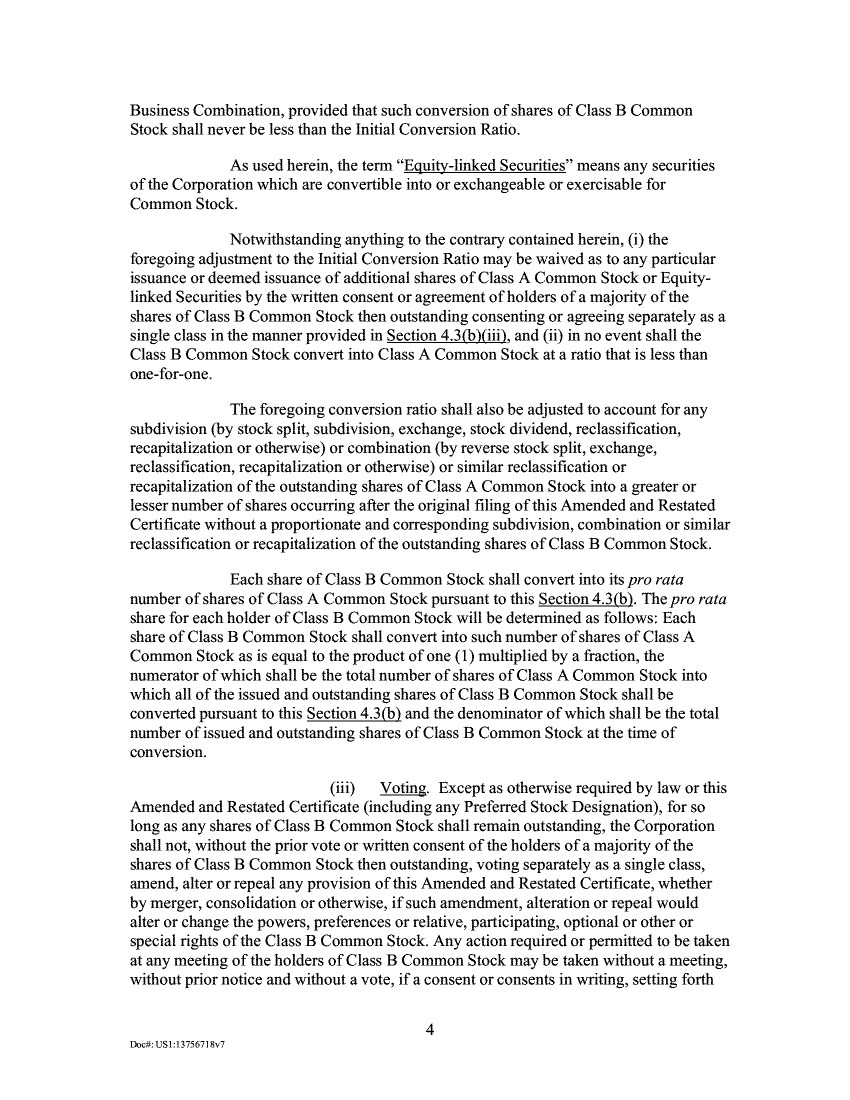 Business Combination, provided that such conversion of shares of Class B Common Stock shall never be less than the Initial Conversion Ratio. As used herein, the term "Equity-linked Securities" means any securities of the Corporation which are convertible into or exchangeable or exercisable for Common Stock. Notwithstanding anything to the contrary contained herein, (i) the foregoing adjustment to the Initial Conversion Ratio may be waived as to any particular issuance or deemed issuance of additional shares of Class A Common Stock or Equity-linked Securities by the written consent or agreement of holders of a majority of the shares of Class B Common Stock then outstanding consenting or agreeing separately as a single class in the manner provided in Section 4.3(bXiiii, and (ii) in no event shall the Class B Common Stock convert into Class A Common Stock at a ratio that is less than one-for-one. The foregoing conversion ratio shall also be adjusted to account for any subdivision (by stock split, subdivision, exchange, stock dividend, reclassification, recapitalization or otherwise) or combination (by reverse stock split, exchange, reclassification, recapitalization or otherwise) or similar reclassification or recapitalization of the outstanding shares of Class A Common Stock into a greater or lesser number of shares occurring after the original filing of this Amended and Restated Certificate without a proportionate and corresponding subdivision, combination or similar reclassification or recapitalization of the outstanding shares of Class B Common Stock. Each share of Class B Common Stock shall convert into its pro rata number of shares of Class A Common Stock pursuant to this Section 4.3(b). The pro rata share for each holder of Class B Common Stock will be determined as follows: Each share of Class B Common Stock shall convert into such number of shares of Class A Common Stock as is equal to the product of one (1) multiplied by a fraction, the numerator of which shall be the total number of shares of Class A Common Stock into which all of the issued and outstanding shares of Class B Common Stock shall be converted pursuant to this Section 4.3(b) and the denominator of which shall be the total number of issued and outstanding shares of Class B Common Stock at the time of conversion. (iii) Voting. Except as otherwise required by law or this Amended and Restated Certificate (including any Preferred Stock Designation), for so long as any shares of Class B Common Stock shall remain outstanding, the Corporation shall not, without the prior vote or written consent of the holders of a majority of the shares of Class B Common Stock then outstanding, voting separately as a single class, amend, alter or repeal any provision of this Amended and Restated Certificate, whether by merger, consolidation or otherwise, if such amendment, alteration or repeal would alter or change the powers, preferences or relative, participating, optional or other or special rights of the Class B Common Stock. Any action required or permitted to be taken at any meeting of the holders of Class B Common Stock may be taken without a meeting, without prior notice and without a vote, if a consent or consents in writing, setting forth 4 DoctUSI:13756718v7