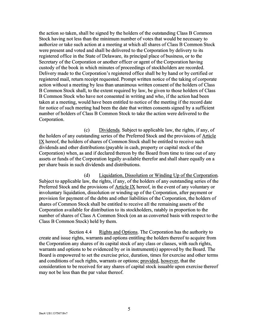 the action so taken, shall be signed by the holders of the outstanding Class B Common Stock having not less than the minimum number of votes that would be necessary to authorize or take such action at a meeting at which all shares of Class B Common Stock were present and voted and shall be delivered to the Corporation by delivery to its registered office in the State of Delaware, its principal place of business, or to the Secretary of the Corporation or another officer or agent of the Corporation having custody of the book in which minutes of proceedings of stockholders are recorded. Delivery made to the Corporation's registered office shall be by hand or by certified or registered mail, return receipt requested. Prompt written notice of the taking of corporate action without a meeting by less than unanimous written consent of the holders of Class B Common Stock shall, to the extent required by law, be given to those holders of Class B Common Stock who have not consented in writing and who, if the action had been taken at a meeting, would have been entitled to notice of the meeting if the record date for notice of such meeting had been the date that written consents signed by a sufficient number of holders of Class B Common Stock to take the action were delivered to the Corporation. Dividends. Subject to applicable law, the rights, if any, of the holders of any outstanding series of the Preferred Stock and the provisions of Article IX hereof, the holders of shares of Common Stock shall be entitled to receive such dividends and other distributions (payable in cash, property or capital stock of the Corporation) when, as and if declared thereon by the Board from time to time out of any assets or funds of the Corporation legally available therefor and shall share equally on a per share basis in such dividends and distributions. Liquidation, Dissolution or Winding UP of the Corporation. Subject to applicable law, the rights, if any, of the holders of any outstanding series of the Preferred Stock and the provisions of Article IX hereof, in the event of any voluntary or involuntary liquidation, dissolution or winding up of the Corporation, after payment or provision for payment of the debts and other liabilities of the Corporation, the holders of shares of Common Stock shall be entitled to receive all the remaining assets of the Corporation available for distribution to its stockholders, ratably in proportion to the number of shares of Class A Common Stock (on an as converted basis with respect to the Class B Common Stock) held by them. Section 4.4 Rights and Options. The Corporation has the authority to create and issue rights, warrants and options entitling the holders thereof to acquire from the Corporation any shares of its capital stock of any class or classes, with such rights, warrants and options to be evidenced by or in instrument(s) approved by the Board. The Board is empowered to set the exercise price, duration, times for exercise and other terms and conditions of such rights, warrants or options; provided, however, that the consideration to be received for any shares of capital stock issuable upon exercise thereof may not be less than the par value thereof. 5 Dad,: USI:13756713V7