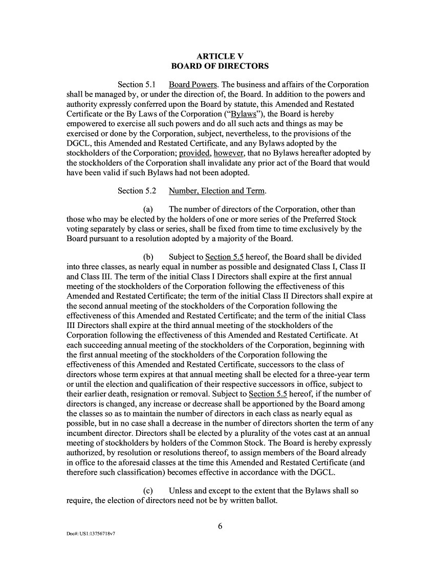 ARTICLE V BOARD OF DIRECTORS Section 5.1 Board Powers. The business and affairs of the Corporation shall be managed by, or under the direction of, the Board. In addition to the powers and authority expressly conferred upon the Board by statute, this Amended and Restated Certificate or the By Laws of the Corporation ("Bylaws"), the Board is hereby empowered to exercise all such powers and do all such acts and things as may be exercised or done by the Corporation, subject, nevertheless, to the provisions of the DGCL, this Amended and Restated Certificate, and any Bylaws adopted by the stockholders of the Corporation; provided, however, that no Bylaws hereafter adopted by the stockholders of the Corporation shall invalidate any prior act of the Board that would have been valid if such Bylaws had not been adopted. Section 5.2 Number, Election and Term. The number of directors of the Corporation, other than those who may be elected by the holders of one or more series of the Preferred Stock voting separately by class or series, shall be fixed from time to time exclusively by the Board pursuant to a resolution adopted by a majority of the Board. Subject to Section 5.5 hereof, the Board shall be divided into three classes, as nearly equal in number as possible and designated Class I, Class II and Class III. The term of the initial Class I Directors shall expire at the first annual meeting of the stockholders of the Corporation following the effectiveness of this Amended and Restated Certificate; the term of the initial Class II Directors shall expire at the second annual meeting of the stockholders of the Corporation following the effectiveness of this Amended and Restated Certificate; and the term of the initial Class III Directors shall expire at the third annual meeting of the stockholders of the Corporation following the effectiveness of this Amended and Restated Certificate. At each succeeding annual meeting of the stockholders of the Corporation, beginning with the first annual meeting of the stockholders of the Corporation following the effectiveness of this Amended and Restated Certificate, successors to the class of directors whose term expires at that annual meeting shall be elected for a three-year term or until the election and qualification of their respective successors in office, subject to their earlier death, resignation or removal. Subject to Section 5.5 hereof, if the number of directors is changed, any increase or decrease shall be apportioned by the Board among the classes so as to maintain the number of directors in each class as nearly equal as possible, but in no case shall a decrease in the number of directors shorten the term of any incumbent director. Directors shall be elected by a plurality of the votes cast at an annual meeting of stockholders by holders of the Common Stock. The Board is hereby expressly authorized, by resolution or resolutions thereof, to assign members of the Board already in office to the aforesaid classes at the time this Amended and Restated Certificate (and therefore such classification) becomes effective in accordance with the DGCL. Unless and except to the extent that the Bylaws shall so require, the election of directors need not be by written ballot. 6 DoctUSI:13756718v7