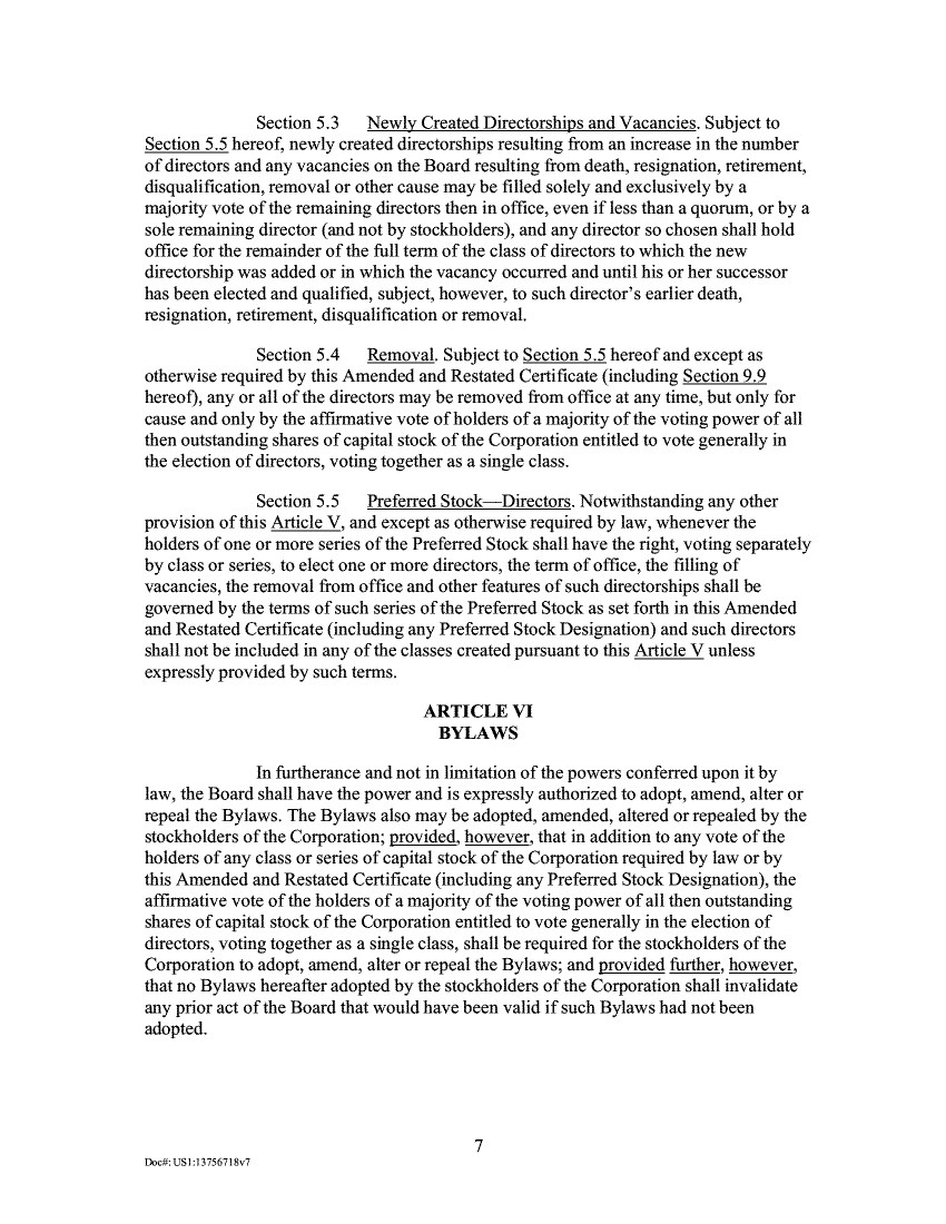 Section 5.3 Newly Created Directorships and Vacancies. Subject to Section 5.5 hereof, newly created directorships resulting from an increase in the number of directors and any vacancies on the Board resulting from death, resignation, retirement, disqualification, removal or other cause may be filled solely and exclusively by a majority vote of the remaining directors then in office, even if less than a quorum, or by a sole remaining director (and not by stockholders), and any director so chosen shall hold office for the remainder of the full term of the class of directors to which the new directorship was added or in which the vacancy occurred and until his or her successor has been elected and qualified, subject, however, to such director's earlier death, resignation, retirement, disqualification or removal. Section 5.4 Removal. Subject to Section 5.5 hereof and except as otherwise required by this Amended and Restated Certificate (including Section 9.9 hereof), any or all of the directors may be removed from office at any time, but only for cause and only by the affirmative vote of holders of a majority of the voting power of all then outstanding shares of capital stock of the Corporation entitled to vote generally in the election of directors, voting together as a single class. Section 5.5 Preferred Stock—Directors. Notwithstanding any other provision of this Article V, and except as otherwise required by law, whenever the holders of one or more series of the Preferred Stock shall have the right, voting separately by class or series, to elect one or more directors, the term of office, the filling of vacancies, the removal from office and other features of such directorships shall be governed by the terms of such series of the Preferred Stock as set forth in this Amended and Restated Certificate (including any Preferred Stock Designation) and such directors shall not be included in any of the classes created pursuant to this Article V unless expressly provided by such terms. ARTICLE VI BYLAWS In furtherance and not in limitation of the powers conferred upon it by law, the Board shall have the power and is expressly authorized to adopt, amend, alter or repeal the Bylaws. The Bylaws also may be adopted, amended, altered or repealed by the stockholders of the Corporation; provided, however, that in addition to any vote of the holders of any class or series of capital stock of the Corporation required by law or by this Amended and Restated Certificate (including any Preferred Stock Designation), the affirmative vote of the holders of a majority of the voting power of all then outstanding shares of capital stock of the Corporation entitled to vote generally in the election of directors, voting together as a single class, shall be required for the stockholders of the Corporation to adopt, amend, alter or repeal the Bylaws; and provided further, however, that no Bylaws hereafter adopted by the stockholders of the Corporation shall invalidate any prior act of the Board that would have been valid if such Bylaws had not been adopted. 7 DodkUS1:13756718v7