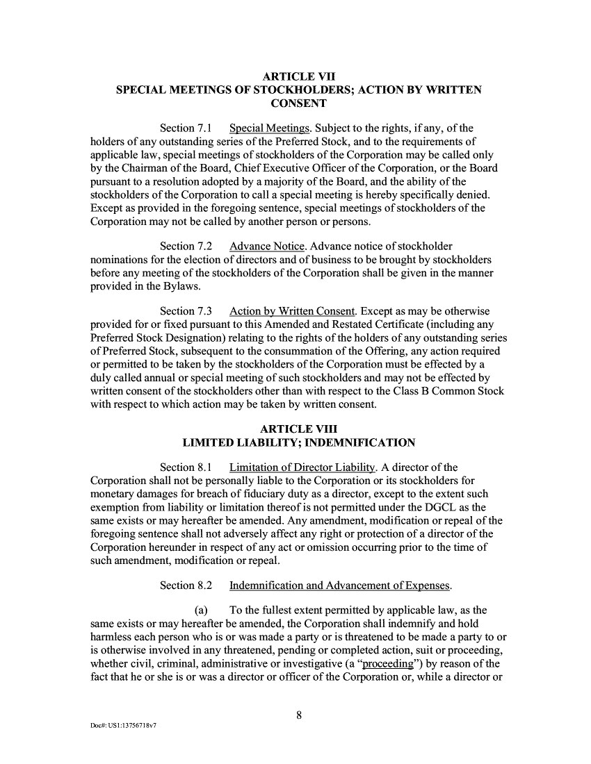 ARTICLE VII SPECIAL MEETINGS OF STOCKHOLDERS; ACTION BY WRITTEN CONSENT Section 7.1 Special Meetings. Subject to the rights, if any, of the holders of any outstanding series of the Preferred Stock, and to the requirements of applicable law, special meetings of stockholders of the Corporation may be called only by the Chairman of the Board, Chief Executive Officer of the Corporation, or the Board pursuant to a resolution adopted by a majority of the Board, and the ability of the stockholders of the Corporation to call a special meeting is hereby specifically denied. Except as provided in the foregoing sentence, special meetings of stockholders of the Corporation may not be called by another person or persons. Section 7.2 Advance Notice. Advance notice of stockholder nominations for the election of directors and of business to be brought by stockholders before any meeting of the stockholders of the Corporation shall be given in the manner provided in the Bylaws. Section 7.3 Action by Written Consent. Except as may be otherwise provided for or fixed pursuant to this Amended and Restated Certificate (including any Preferred Stock Designation) relating to the rights of the holders of any outstanding series of Preferred Stock, subsequent to the consummation of the Offering, any action required or permitted to be taken by the stockholders of the Corporation must be effected by a duly called annual or special meeting of such stockholders and may not be effected by written consent of the stockholders other than with respect to the Class B Common Stock with respect to which action may be taken by written consent. ARTICLE VIII LIMITED LIABILITY; INDEMNIFICATION Section 8.1 Limitation of Director Liability. A director of the Corporation shall not be personally liable to the Corporation or its stockholders for monetary damages for breach of fiduciary duty as a director, except to the extent such exemption from liability or limitation thereof is not permitted under the DGCL as the same exists or may hereafter be amended. Any amendment, modification or repeal of the foregoing sentence shall not adversely affect any right or protection of a director of the Corporation hereunder in respect of any act or omission occurring prior to the time of such amendment, modification or repeal. Section 8.2 Indemnification and Advancement of Expenses. (a) To the fullest extent permitted by applicable law, as the same exists or may hereafter be amended, the Corporation shall indemnify and hold harmless each person who is or was made a party or is threatened to be made a party to or is otherwise involved in any threatened, pending or completed action, suit or proceeding, whether civil, criminal, administrative or investigative (a "proceeding") by reason of the fact that he or she is or was a director or officer of the Corporation or, while a director or 8 Doet:IJS1:13756718v7