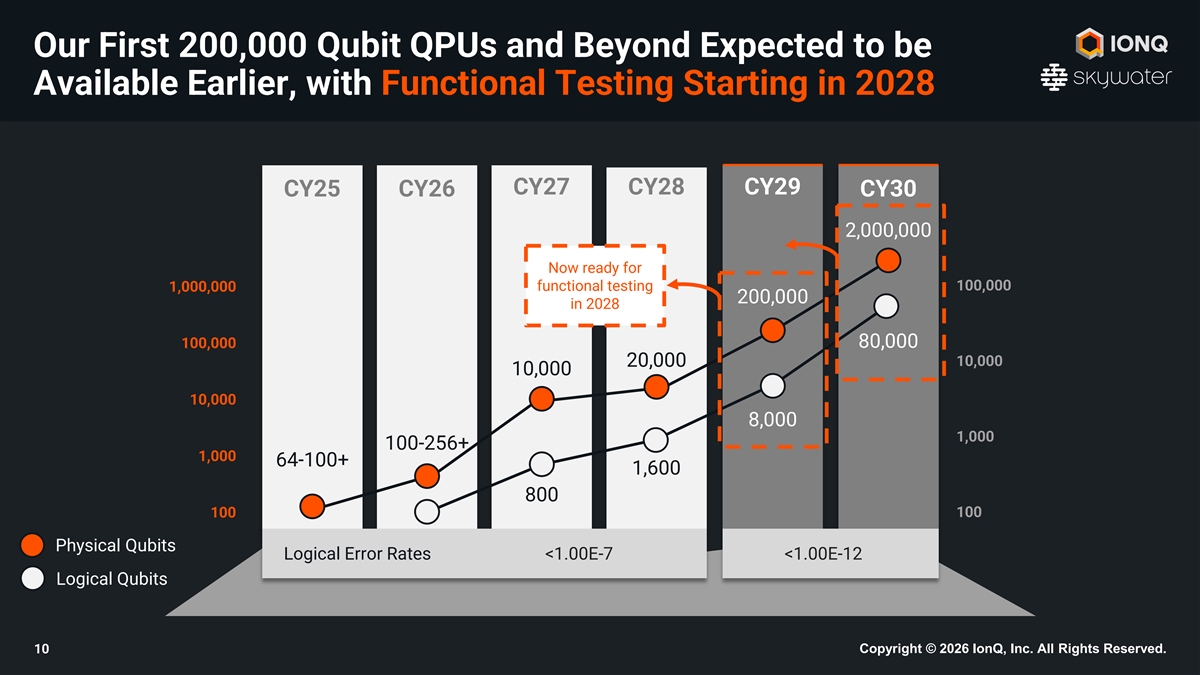 Accelerating the Path to Fault-Tolerant Quantum Computing via Embedded Access to Trusted Foundry ACCELERATES TOTAL REDUCED CHIP CHIP CYCLE TIMES AND ROADMAP ITERATION TIMES 256-qubit chip cycle time expected to Faster learning cycles 1 accelerate engineering reduce from 9 months to 2 months pace Standard 9 Months Fab Cycle PROTOTYPING MULTIPLE Embedded 4.5X 2 Months GENERATIONS IN PARALLEL Access Cycle Acceleration Accelerating tech development to bring First 200,000 Qubit QPUs Enabling 8,000 Logical Qubits Now in roadmap Forecast to Become Available For Functional Testing In 2028 1. Cycle time refers to the total time from design files being complete to first devices being available to test 9 Copyright © 2026 IonQ, Inc. All Rights Reserved.
