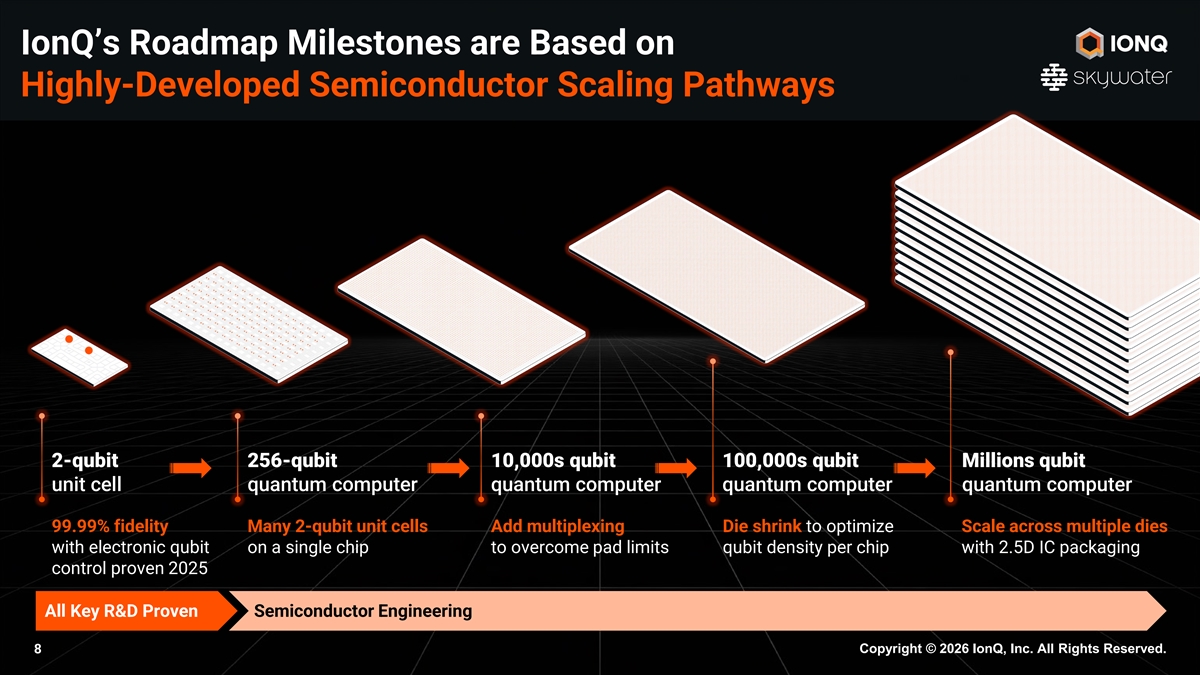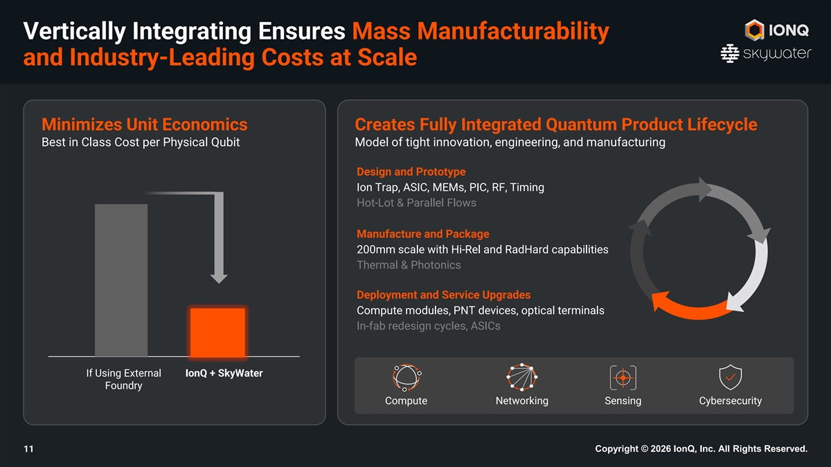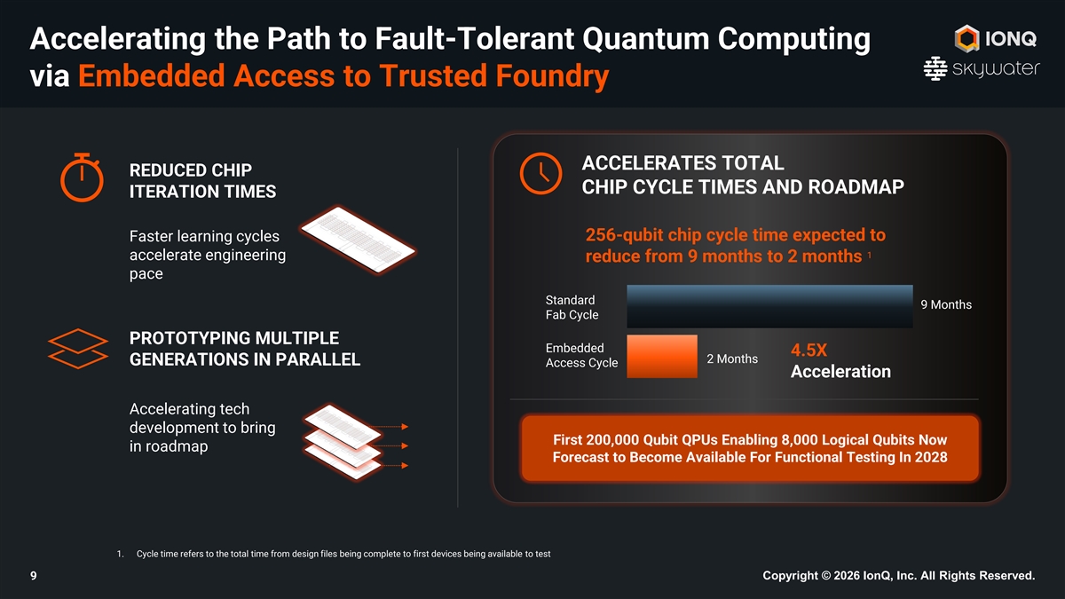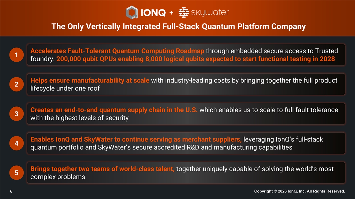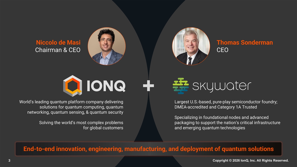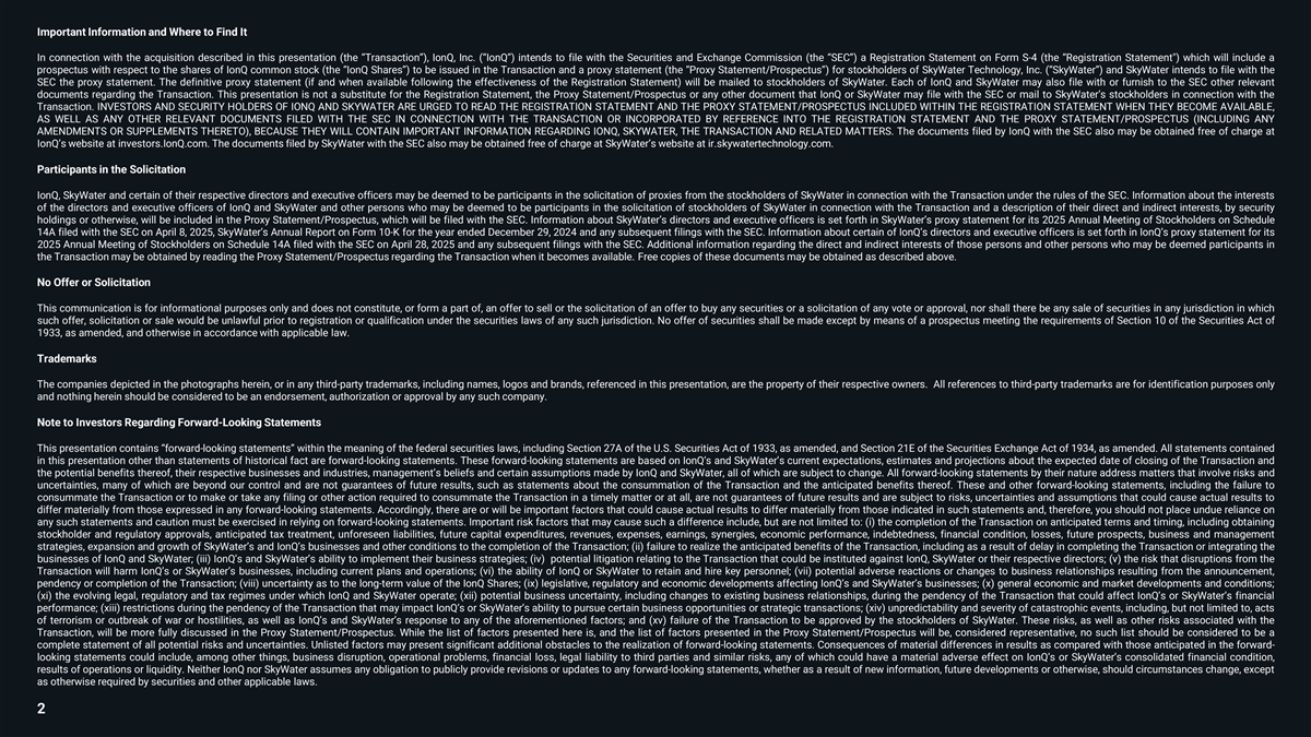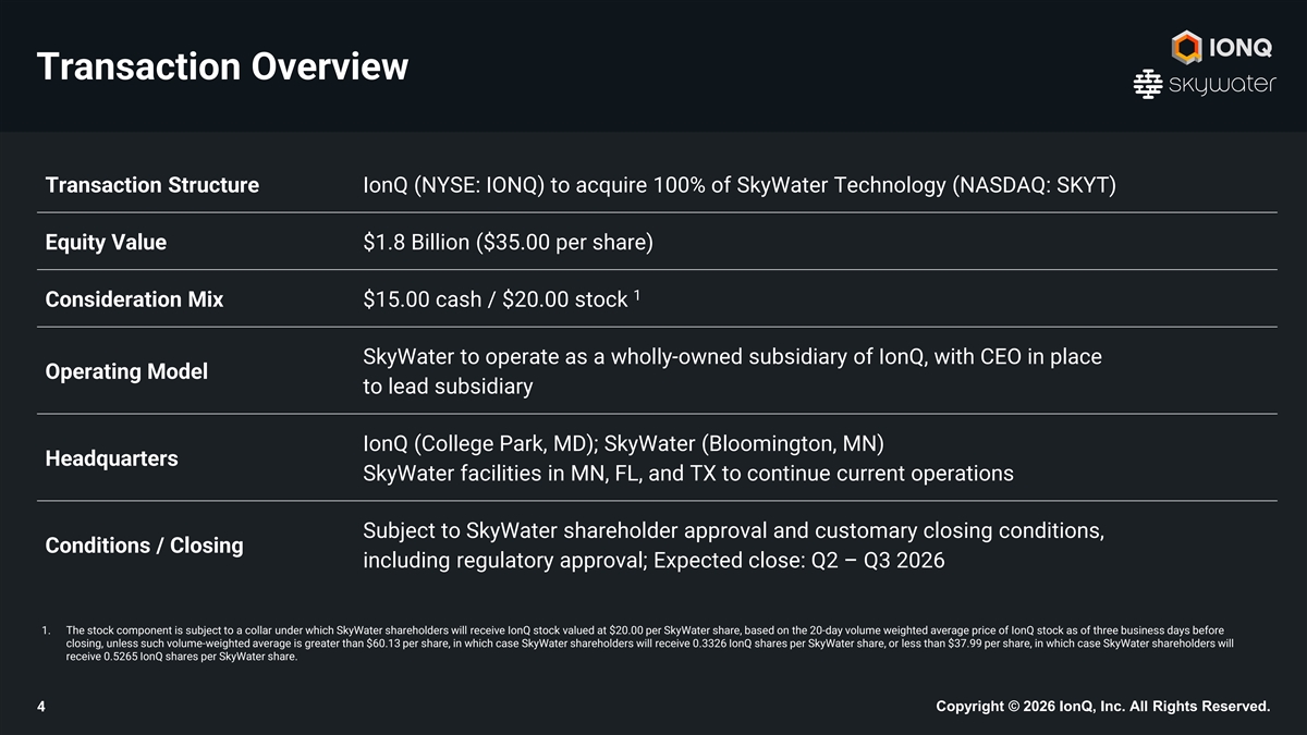 Important Information and Where to Find It In connection with the acquisition described in this presentation (the “Transaction”), IonQ, Inc. (“IonQ”) intends to file with the Securities and Exchange Commission (the “SEC”) a Registration Statement on Form S-4 (the “Registration Statement ) which will include a prospectus with respect to the shares of IonQ common stock (the “IonQ Shares”) to be issued in the Transaction and a proxy statement (the “Proxy Statement/Prospectus”) for stockholders of SkyWater Technology, Inc. (“SkyWater”) and SkyWater intends to file with the SEC the proxy statement. The definitive proxy statement (if and when available following the effectiveness of the Registration Statement) will be mailed to stockholders of SkyWater. Each of IonQ and SkyWater may also file with or furnish to the SEC other relevant documents regarding the Transaction. This presentation is not a substitute for the Registration Statement, the Proxy Statement/Prospectus or any other document that IonQ or SkyWater may file with the SEC or mail to SkyWater’s stockholders in connection with the Transaction. INVESTORS AND SECURITY HOLDERS OF IONQ AND SKYWATER ARE URGED TO READ THE REGISTRATION STATEMENT AND THE PROXY STATEMENT/PROSPECTUS INCLUDED WITHIN THE REGISTRATION STATEMENT WHEN THEY BECOME AVAILABLE, AS WELL AS ANY OTHER RELEVANT DOCUMENTS FILED WITH THE SEC IN CONNECTION WITH THE TRANSACTION OR INCORPORATED BY REFERENCE INTO THE REGISTRATION STATEMENT AND THE PROXY STATEMENT/PROSPECTUS (INCLUDING ANY AMENDMENTS OR SUPPLEMENTS THERETO), BECAUSE THEY WILL CONTAIN IMPORTANT INFORMATION REGARDING IONQ, SKYWATER, THE TRANSACTION AND RELATED MATTERS. The documents filed by IonQ with the SEC also may be obtained free of charge at IonQ’s website at investors.IonQ.com. The documents filed by SkyWater with the SEC also may be obtained free of charge at SkyWater’s website at ir.skywatertechnology.com. Participants in the Solicitation IonQ, SkyWater and certain of their respective directors and executive officers may be deemed to be participants in the solicitation of proxies from the stockholders of SkyWater in connection with the Transaction under the rules of the SEC. Information about the interests of the directors and executive officers of IonQ and SkyWater and other persons who may be deemed to be participants in the solicitation of stockholders of SkyWater in connection with the Transaction and a description of their direct and indirect interests, by security holdings or otherwise, will be included in the Proxy Statement/Prospectus, which will be filed with the SEC. Information about SkyWater’s directors and executive officers is set forth in SkyWater’s proxy statement for its 2025 Annual Meeting of Stockholders on Schedule 14A filed with the SEC on April 8, 2025, SkyWater’s Annual Report on Form 10-K for the year ended December 29, 2024 and any subsequent filings with the SEC. Information about certain of IonQ’s directors and executive officers is set forth in IonQ’s proxy statement for its 2025 Annual Meeting of Stockholders on Schedule 14A filed with the SEC on April 28, 2025 and any subsequent filings with the SEC. Additional information regarding the direct and indirect interests of those persons and other persons who may be deemed participants in the Transaction may be obtained by reading the Proxy Statement/Prospectus regarding the Transaction when it becomes available. Free copies of these documents may be obtained as described above. No Offer or Solicitation This communication is for informational purposes only and does not constitute, or form a part of, an offer to sell or the solicitation of an offer to buy any securities or a solicitation of any vote or approval, nor shall there be any sale of securities in any jurisdiction in which such offer, solicitation or sale would be unlawful prior to registration or qualification under the securities laws of any such jurisdiction. No offer of securities shall be made except by means of a prospectus meeting the requirements of Section 10 of the Securities Act of 1933, as amended, and otherwise in accordance with applicable law. Trademarks The companies depicted in the photographs herein, or in any third-party trademarks, including names, logos and brands, referenced in this presentation, are the property of their respective owners. All references to third-party trademarks are for identification purposes only and nothing herein should be considered to be an endorsement, authorization or approval by any such company. Note to Investors Regarding Forward-Looking Statements This presentation contains “forward-looking statements” within the meaning of the federal securities laws, including Section 27A of the U.S. Securities Act of 1933, as amended, and Section 21E of the Securities Exchange Act of 1934, as amended. All statements contained in this presentation other than statements of historical fact are forward-looking statements. These forward-looking statements are based on IonQ’s and SkyWater’s current expectations, estimates and projections about the expected date of closing of the Transaction and the potential benefits thereof, their respective businesses and industries, management’s beliefs and certain assumptions made by IonQ and SkyWater, all of which are subject to change. All forward-looking statements by their nature address matters that involve risks and uncertainties, many of which are beyond our control and are not guarantees of future results, such as statements about the consummation of the Transaction and the anticipated benefits thereof. These and other forward-looking statements, including the failure to consummate the Transaction or to make or take any filing or other action required to consummate the Transaction in a timely matter or at all, are not guarantees of future results and are subject to risks, uncertainties and assumptions that could cause actual results to differ ma