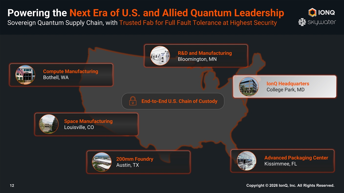 Vertically Integrating Ensures Mass Manufacturability and Industry-Leading Costs at Scale Minimizes Unit Economics Creates Fully Integrated Quantum Product Lifecycle Best in Class Cost per Physical Qubit Model of tight innovation, engineering, and manufacturing Design and Prototype Ion Trap, ASIC, MEMs, PIC, RF, Timing Hot-Lot & Parallel Flows Manufacture and Package 200mm scale with Hi-Rel and RadHard capabilities Thermal & Photonics Deployment and Service Upgrades Compute modules, PNT devices, optical terminals In-fab redesign cycles, ASICs If Using External IonQ + SkyWater Foundry Compute Networking Sensing Cybersecurity 11 Copyright © 2026 IonQ, Inc. All Rights Reserved.