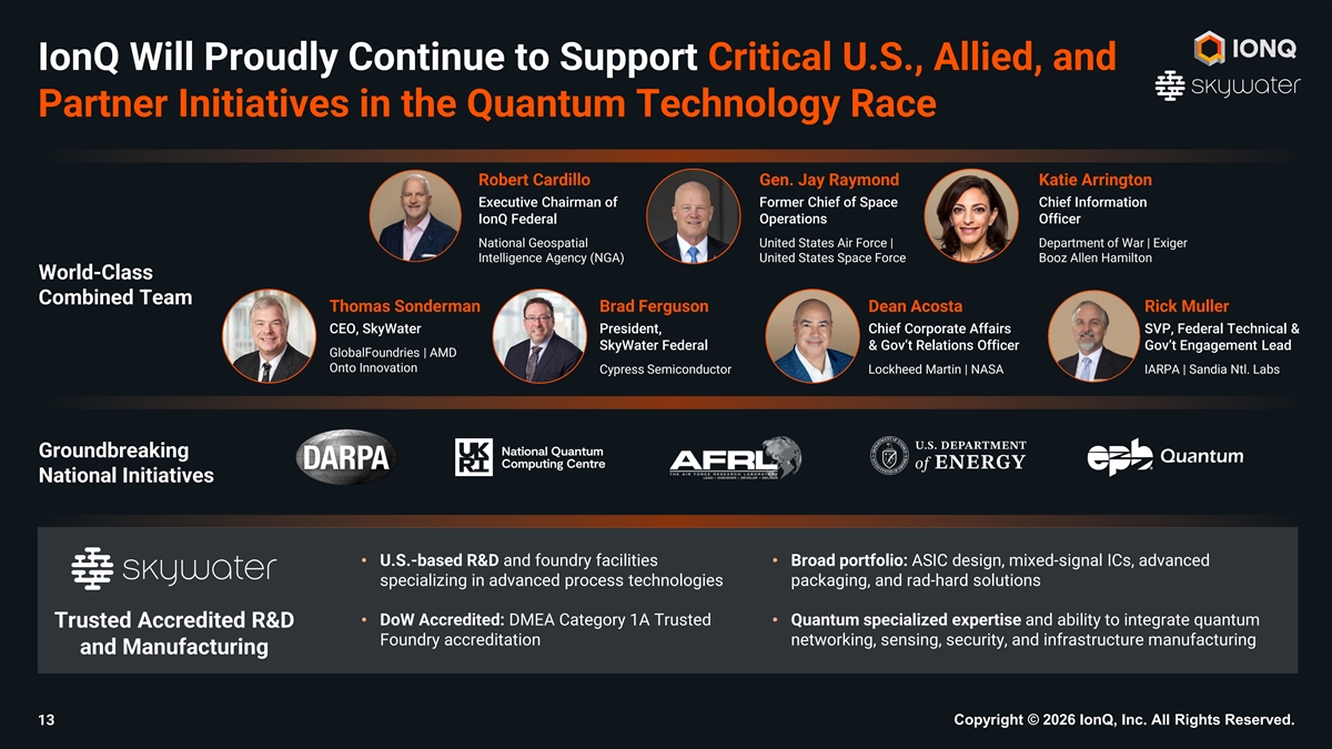 Powering the Next Era of U.S. and Allied Quantum Leadership Sovereign Quantum Supply Chain, with Trusted Fab for Full Fault Tolerance at Highest Security R&D and Manufacturing Bloomington, MN Compute Manufacturing Bothell, WA IonQ Headquarters College Park, MD End-to-End U.S. Chain of Custody Space Manufacturing Louisville, CO Advanced Packaging Center 200mm Foundry Kissimmee, FL Austin, TX 12 C Co op py yr riig gh ht t © © 20 2026 26 I Io on nQ Q,, I In nc c.. A Allll R Riig gh ht ts R s Re ese ser rv ved ed..