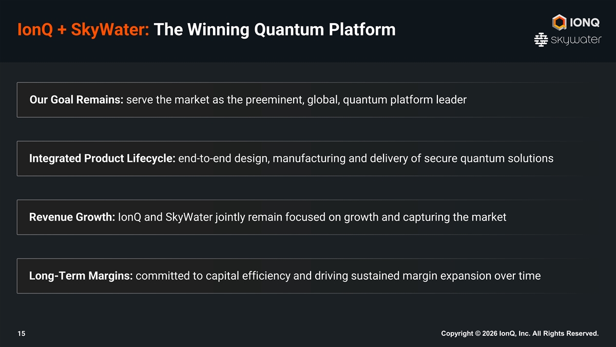 SkyWater Acquisition Follows Deliberate Strategy to Build and Accelerate Our Full-Stack Quantum Platform 1 Capella & Skyloom ID Quantique Cybersecurity Lightsynq Vector Atomic Networking Sensing Compute Oxford Ionics Copyright © 2026 IonQ, Inc. All Rights Reserved. 14 1. Skyloom acquisition is pending close Copyright © 2026 IonQ, Inc. All Rights Reserved.
