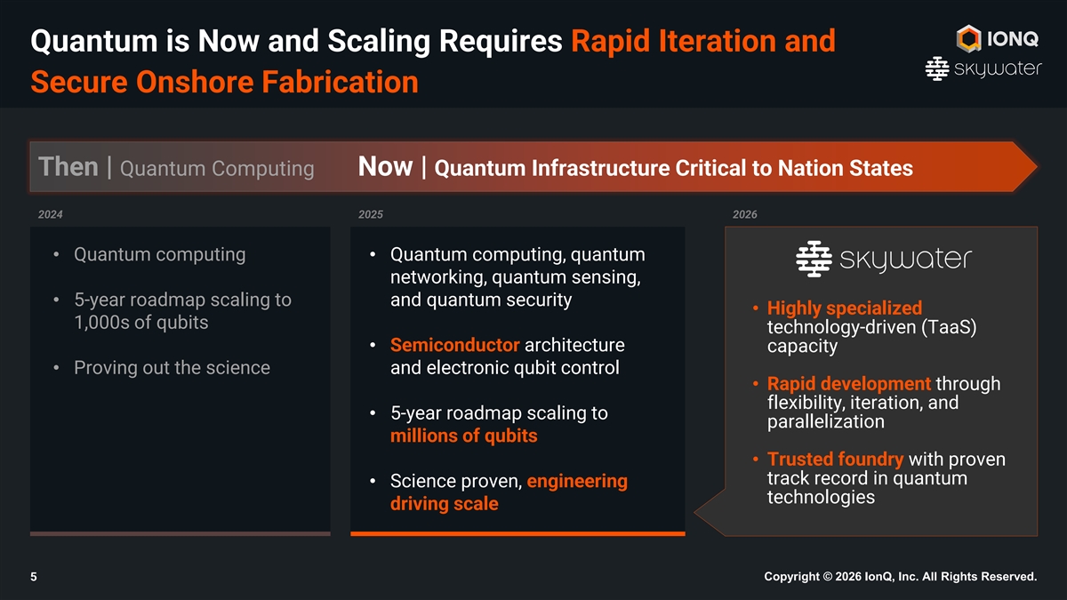 Transaction Overview Transaction Structure IonQ (NYSE: IONQ) to acquire 100% of SkyWater Technology (NASDAQ: SKYT) Equity Value $1.8 Billion ($35.00 per share) 1 Consideration Mix $15.00 cash / $20.00 stock SkyWater to operate as a wholly-owned subsidiary of IonQ, with CEO in place Operating Model to lead subsidiary IonQ (College Park, MD); SkyWater (Bloomington, MN) Headquarters SkyWater facilities in MN, FL, and TX to continue current operations Subject to SkyWater shareholder approval and customary closing conditions, Conditions / Closing including regulatory approval; Expected close: Q2 – Q3 2026 1. The stock component is subject to a collar under which SkyWater shareholders will receive IonQ stock valued at $20.00 per SkyWater share, based on the 20-day volume weighted average price of IonQ stock as of three business days before closing, unless such volume-weighted average is greater than $60.13 per share, in which case SkyWater shareholders will receive 0.3326 IonQ shares per SkyWater share, or less than $37.99 per share, in which case SkyWater shareholders will receive 0.5265 IonQ shares per SkyWater share. 4 Copyright © 2026 IonQ, Inc. All Rights Reserved.