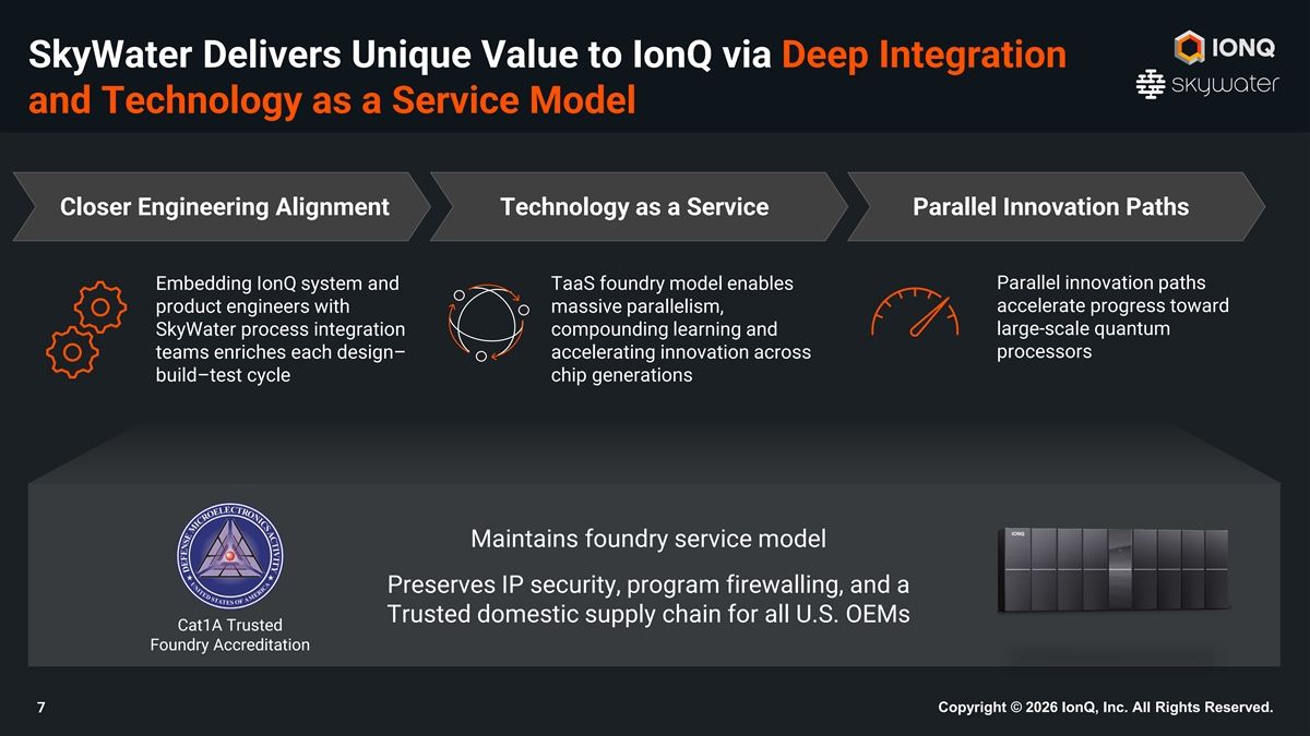 + The Only Vertically Integrated Full-Stack Quantum Platform Company Accelerates Fault-Tolerant Quantum Computing Roadmap through embedded secure access to Trusted 1 foundry. 200,000 qubit QPUs enabling 8,000 logical qubits expected to start functional testing in 2028 Helps ensure manufacturability at scale with industry-leading costs by bringing together the full product 2 lifecycle under one roof Creates an end-to-end quantum supply chain in the U.S. which enables us to scale to full fault tolerance 3 with the highest levels of security Enables IonQ and SkyWater to continue serving as merchant suppliers, leveraging IonQ’s full-stack 4 quantum portfolio and SkyWater’s secure accredited R&D and manufacturing capabilities Brings together two teams of world-class talent, together uniquely capable of solving the world’s most 5 complex problems 6 Copyright © 2026 IonQ, Inc. All Rights Reserved.