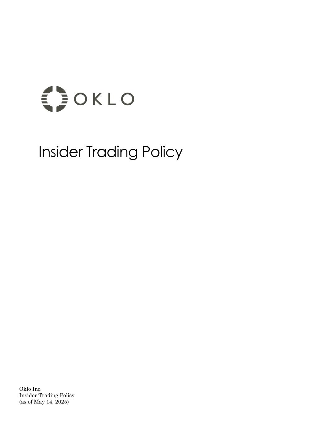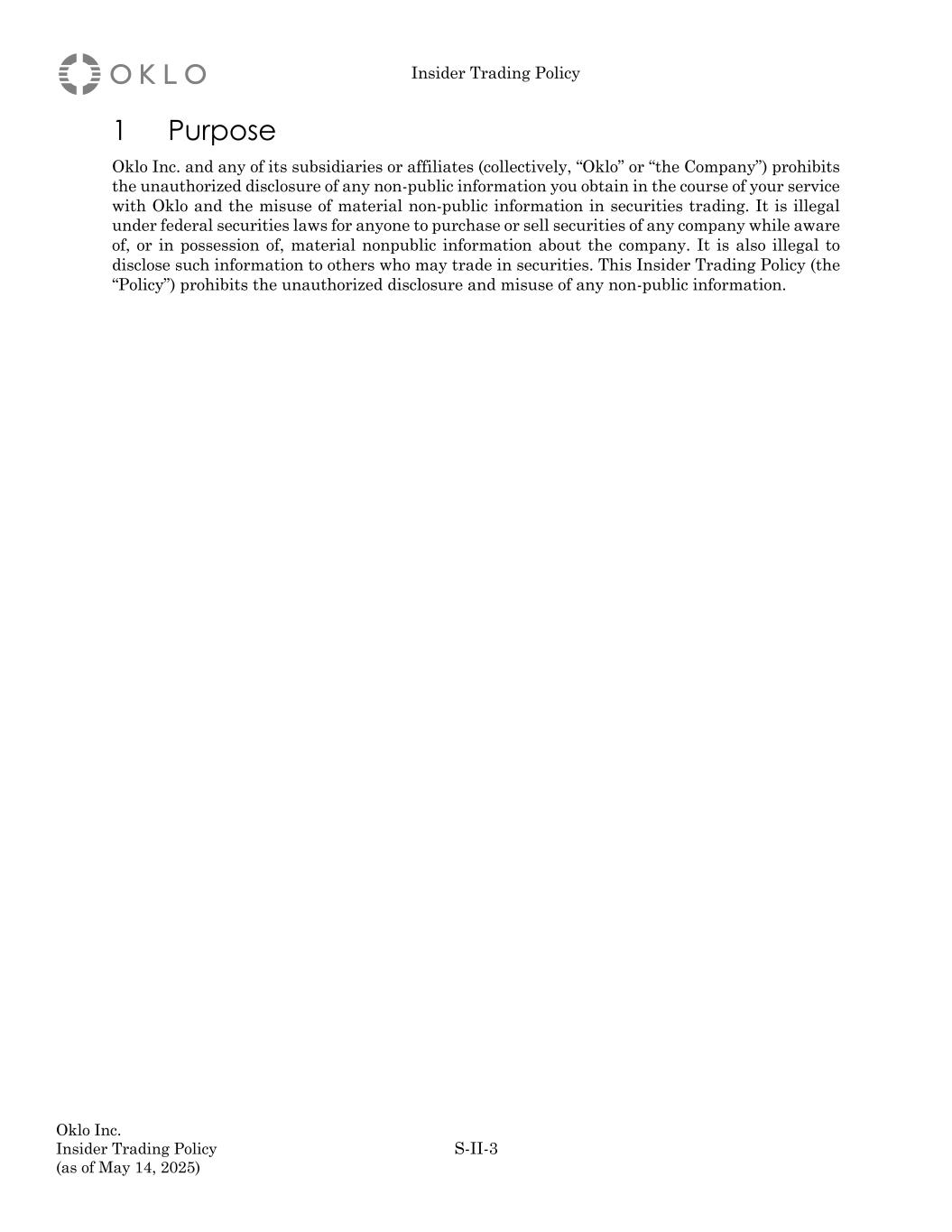 Oklo Inc. Insider Trading Policy (as of May 14, 2025) S-II-1 Insider Trading Policy Table of contents Table of contents ...................................................................................................................... 1 1 Purpose ............................................................................................................................... 3 2 Scope ................................................................................................................................... 4 3 Policy .................................................................................................................................. 5 3.1 Prohibitions on insider trading ................................................................................... 5 3.2 Detection and prosecution of insider trading ............................................................. 5 3.3 Compliance officer ....................................................................................................... 6 3.4 Reporting violations ..................................................................................................... 6 3.5 Personal responsibility ................................................................................................ 6 4 Transactions covered by this Policy ........................................................................... 7 4.1 Types of transactions covered by this Policy .............................................................. 7 4.2 Responsibilities regarding the non-public information of other companies ............. 7 4.3 Applicability of this Policy after your departure ....................................................... 7 4.4 No exceptions based on personal circumstances ........................................................ 7 4.5 Penalties for violation of insider trading laws and this Policy ................................. 8 5 Material non-public information ................................................................................. 9 5.1 “Material” information ................................................................................................ 9 5.2 “Non-public” information ........................................................................................... 10 6 Policies regarding material non-public information ............................................ 11 7 Trading blackout periods ............................................................................................ 12 7.1 Quarterly blackout periods ....................................................................................... 12 7.2 Special blackout periods ............................................................................................ 12 7.3 No “safe harbors” ....................................................................................................... 13 8 Pre-clearance of trades ................................................................................................. 14 9 Additional restrictions and guidance ....................................................................... 15 9.1 Short sales .................................................................................................................. 15 9.2 Derivative securities and hedging transactions ....................................................... 15 9.3 Using Oklo securities as collateral for loans ............................................................ 15 9.4 Holding Oklo securities in margin accounts ............................................................ 16 9.5 Placing open orders with brokers ............................................................................. 16 10 Limited exceptions .................................................................................................... 17 10.1 Transactions pursuant to a trading plan that complies with SEC rules ................ 17 10.2 Receipt and vesting of stock options, restricted stock unites, restricted and stock appreciation rights ................................................................................................................ 18 10.3 Cash or cashless net exercise of stock options ......................................................... 18 10.4 Purchases from the employee stock purchase plan ................................................. 18 10.5 Stock splits, stock dividends, and similar transactions ........................................... 18 10.6 Bona fide gifts and inheritance ................................................................................. 18 10.7 Change in form of ownership .................................................................................... 19 10.8 Other exceptions ........................................................................................................ 19