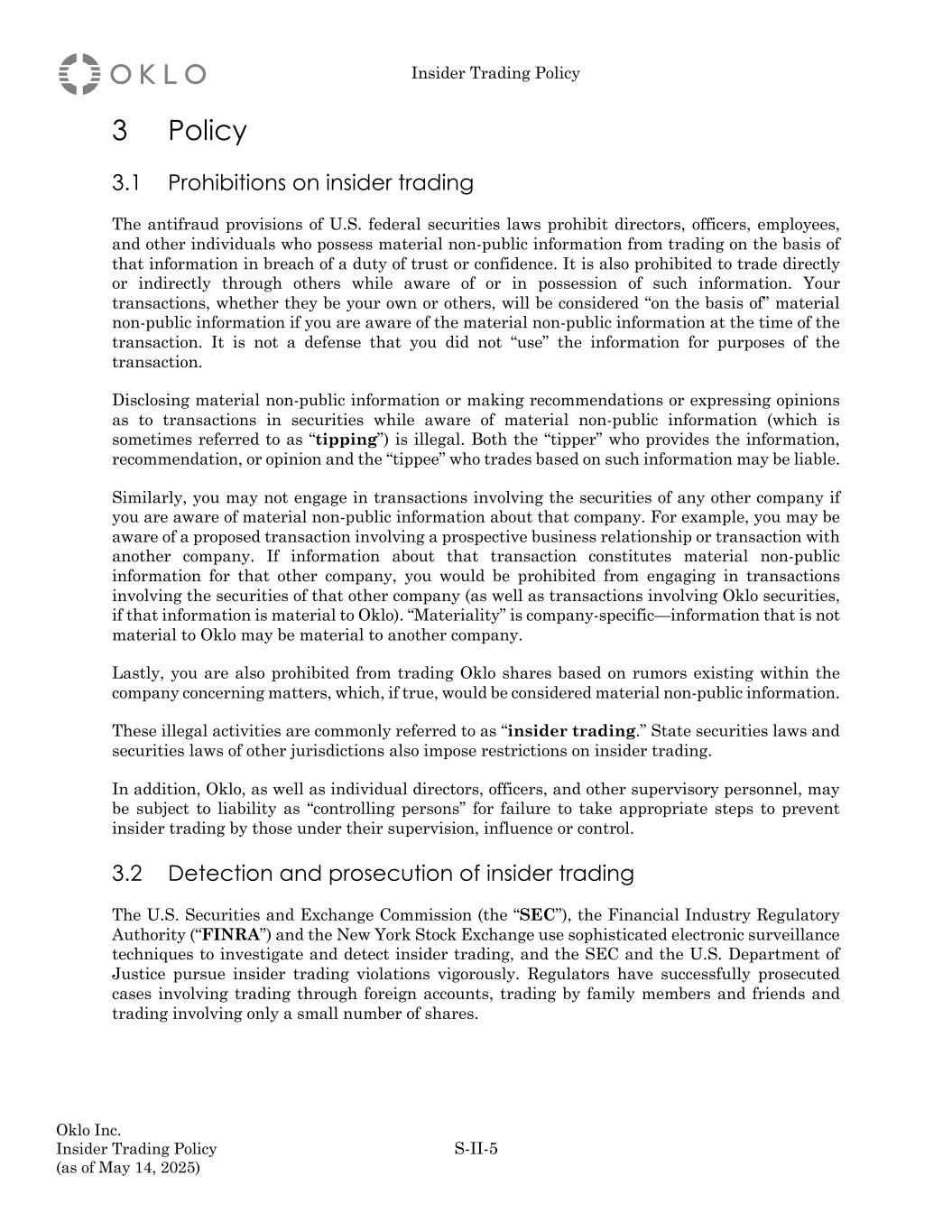 Oklo Inc. Insider Trading Policy (as of May 14, 2025) S-II-5 Insider Trading Policy 3 Policy 3.1 Prohibitions on insider trading The antifraud provisions of U.S. federal securities laws prohibit directors, officers, employees, and other individuals who possess material non-public information from trading on the basis of that information in breach of a duty of trust or confidence. It is also prohibited to trade directly or indirectly through others while aware of or in possession of such information. Your transactions, whether they be your own or others, will be considered “on the basis of” material non-public information if you are aware of the material non-public information at the time of the transaction. It is not a defense that you did not “use” the information for purposes of the transaction. Disclosing material non-public information or making recommendations or expressing opinions as to transactions in securities while aware of material non-public information (which is sometimes referred to as “tipping”) is illegal. Both the “tipper” who provides the information, recommendation, or opinion and the “tippee” who trades based on such information may be liable. Similarly, you may not engage in transactions involving the securities of any other company if you are aware of material non-public information about that company. For example, you may be aware of a proposed transaction involving a prospective business relationship or transaction with another company. If information about that transaction constitutes material non-public information for that other company, you would be prohibited from engaging in transactions involving the securities of that other company (as well as transactions involving Oklo securities, if that information is material to Oklo). “Materiality” is company-specific—information that is not material to Oklo may be material to another company. Lastly, you are also prohibited from trading Oklo shares based on rumors existing within the company concerning matters, which, if true, would be considered material non-public information. These illegal activities are commonly referred to as “insider trading.” State securities laws and securities laws of other jurisdictions also impose restrictions on insider trading. In addition, Oklo, as well as individual directors, officers, and other supervisory personnel, may be subject to liability as “controlling persons” for failure to take appropriate steps to prevent insider trading by those under their supervision, influence or control. 3.2 Detection and prosecution of insider trading The U.S. Securities and Exchange Commission (the “SEC”), the Financial Industry Regulatory Authority (“FINRA”) and the New York Stock Exchange use sophisticated electronic surveillance techniques to investigate and detect insider trading, and the SEC and the U.S. Department of Justice pursue insider trading violations vigorously. Regulators have successfully prosecuted cases involving trading through foreign accounts, trading by family members and friends and trading involving only a small number of shares.