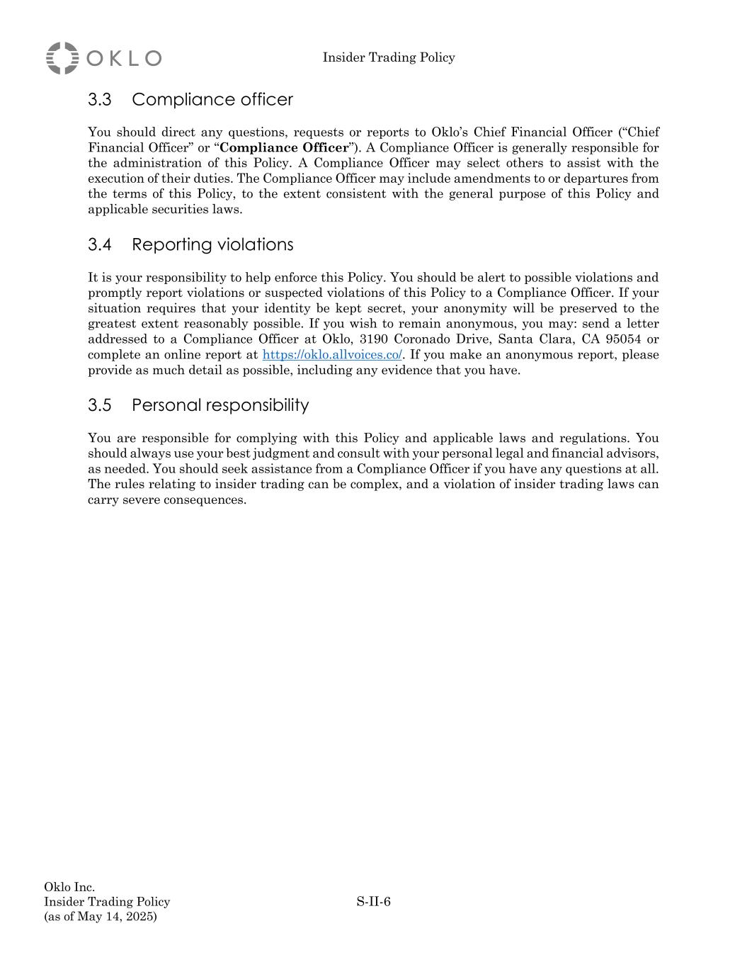 Oklo Inc. Insider Trading Policy (as of May 14, 2025) S-II-6 Insider Trading Policy 3.3 Compliance officer You should direct any questions, requests or reports to Oklo’s Chief Financial Officer (“Chief Financial Officer” or “Compliance Officer”). A Compliance Officer is generally responsible for the administration of this Policy. A Compliance Officer may select others to assist with the execution of their duties. The Compliance Officer may include amendments to or departures from the terms of this Policy, to the extent consistent with the general purpose of this Policy and applicable securities laws. 3.4 Reporting violations It is your responsibility to help enforce this Policy. You should be alert to possible violations and promptly report violations or suspected violations of this Policy to a Compliance Officer. If your situation requires that your identity be kept secret, your anonymity will be preserved to the greatest extent reasonably possible. If you wish to remain anonymous, you may: send a letter addressed to a Compliance Officer at Oklo, 3190 Coronado Drive, Santa Clara, CA 95054 or complete an online report at https://oklo.allvoices.co/. If you make an anonymous report, please provide as much detail as possible, including any evidence that you have. 3.5 Personal responsibility You are responsible for complying with this Policy and applicable laws and regulations. You should always use your best judgment and consult with your personal legal and financial advisors, as needed. You should seek assistance from a Compliance Officer if you have any questions at all. The rules relating to insider trading can be complex, and a violation of insider trading laws can carry severe consequences.