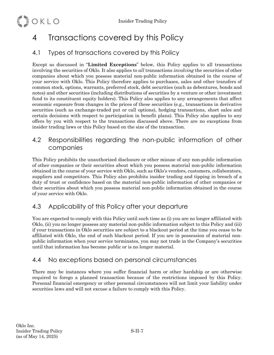Oklo Inc. Insider Trading Policy (as of May 14, 2025) S-II-7 Insider Trading Policy 4 Transactions covered by this Policy 4.1 Types of transactions covered by this Policy Except as discussed in “Limited Exceptions” below, this Policy applies to all transactions involving the securities of Oklo. It also applies to all transactions involving the securities of other companies about which you possess material non-public information obtained in the course of your service with Oklo. This Policy therefore applies to purchases, sales and other transfers of common stock, options, warrants, preferred stock, debt securities (such as debentures, bonds and notes) and other securities (including distributions of securities by a venture or other investment fund to its constituent equity holders). This Policy also applies to any arrangements that affect economic exposure from changes in the prices of these securities (e.g., transactions in derivative securities (such as exchange-traded put or call options), hedging transactions, short sales and certain decisions with respect to participation in benefit plans). This Policy also applies to any offers by you with respect to the transactions discussed above. There are no exceptions from insider trading laws or this Policy based on the size of the transaction. 4.2 Responsibilities regarding the non-public information of other companies This Policy prohibits the unauthorized disclosure or other misuse of any non-public information of other companies or their securities about which you possess material non-public information obtained in the course of your service with Oklo, such as Oklo’s vendors, customers, collaborators, suppliers and competitors. This Policy also prohibits insider trading and tipping in breach of a duty of trust or confidence based on the material non-public information of other companies or their securities about which you possess material non-public information obtained in the course of your service with Oklo. 4.3 Applicability of this Policy after your departure You are expected to comply with this Policy until such time as (i) you are no longer affiliated with Oklo, (ii) you no longer possess any material non-public information subject to this Policy and (iii) if your transactions in Oklo securities are subject to a blackout period at the time you cease to be affiliated with Oklo, the end of such blackout period. If you are in possession of material non- public information when your service terminates, you may not trade in the Company’s securities until that information has become public or is no longer material. 4.4 No exceptions based on personal circumstances There may be instances where you suffer financial harm or other hardship or are otherwise required to forego a planned transaction because of the restrictions imposed by this Policy. Personal financial emergency or other personal circumstances will not limit your liability under securities laws and will not excuse a failure to comply with this Policy.