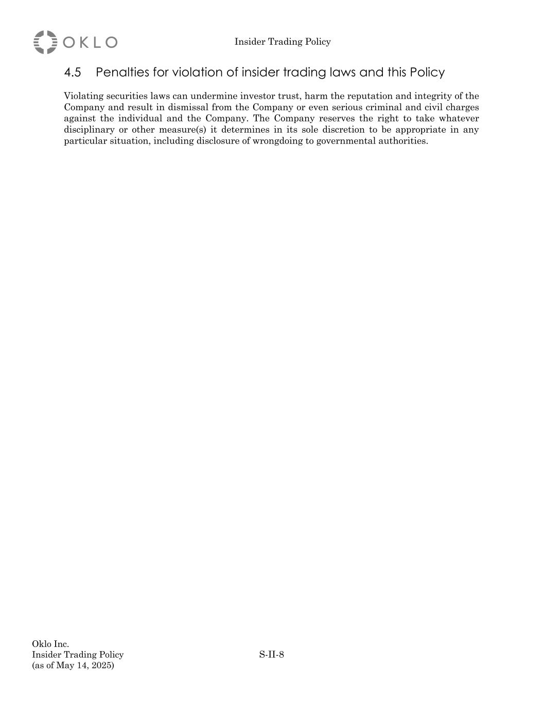 Oklo Inc. Insider Trading Policy (as of May 14, 2025) S-II-8 Insider Trading Policy 4.5 Penalties for violation of insider trading laws and this Policy Violating securities laws can undermine investor trust, harm the reputation and integrity of the Company and result in dismissal from the Company or even serious criminal and civil charges against the individual and the Company. The Company reserves the right to take whatever disciplinary or other measure(s) it determines in its sole discretion to be appropriate in any particular situation, including disclosure of wrongdoing to governmental authorities.