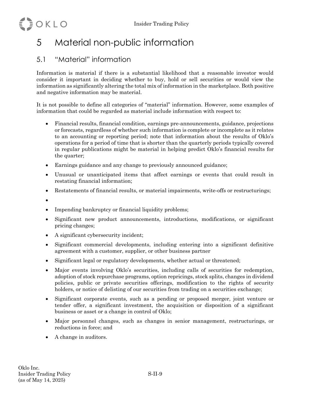 Oklo Inc. Insider Trading Policy (as of May 14, 2025) S-II-9 Insider Trading Policy 5 Material non-public information 5.1 “Material” information Information is material if there is a substantial likelihood that a reasonable investor would consider it important in deciding whether to buy, hold or sell securities or would view the information as significantly altering the total mix of information in the marketplace. Both positive and negative information may be material. It is not possible to define all categories of “material” information. However, some examples of information that could be regarded as material include information with respect to: • Financial results, financial condition, earnings pre-announcements, guidance, projections or forecasts, regardless of whether such information is complete or incomplete as it relates to an accounting or reporting period; note that information about the results of Oklo’s operations for a period of time that is shorter than the quarterly periods typically covered in regular publications might be material in helping predict Oklo’s financial results for the quarter; • Earnings guidance and any change to previously announced guidance; • Unusual or unanticipated items that affect earnings or events that could result in restating financial information; • Restatements of financial results, or material impairments, write-offs or restructurings; • • Impending bankruptcy or financial liquidity problems; • Significant new product announcements, introductions, modifications, or significant pricing changes; • A significant cybersecurity incident; • Significant commercial developments, including entering into a significant definitive agreement with a customer, supplier, or other business partner • Significant legal or regulatory developments, whether actual or threatened; • Major events involving Oklo’s securities, including calls of securities for redemption, adoption of stock repurchase programs, option repricings, stock splits, changes in dividend policies, public or private securities offerings, modification to the rights of security holders, or notice of delisting of our securities from trading on a securities exchange; • Significant corporate events, such as a pending or proposed merger, joint venture or tender offer, a significant investment, the acquisition or disposition of a significant business or asset or a change in control of Oklo; • Major personnel changes, such as changes in senior management, restructurings, or reductions in force; and • A change in auditors.