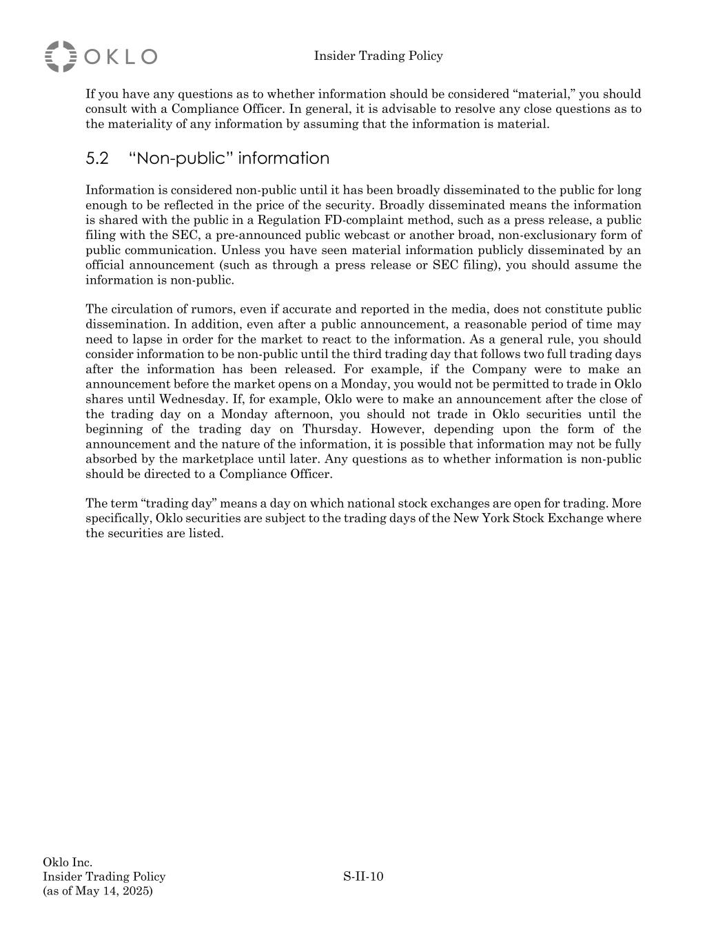 Oklo Inc. Insider Trading Policy (as of May 14, 2025) S-II-10 Insider Trading Policy If you have any questions as to whether information should be considered “material,” you should consult with a Compliance Officer. In general, it is advisable to resolve any close questions as to the materiality of any information by assuming that the information is material. 5.2 “Non-public” information Information is considered non-public until it has been broadly disseminated to the public for long enough to be reflected in the price of the security. Broadly disseminated means the information is shared with the public in a Regulation FD-complaint method, such as a press release, a public filing with the SEC, a pre-announced public webcast or another broad, non-exclusionary form of public communication. Unless you have seen material information publicly disseminated by an official announcement (such as through a press release or SEC filing), you should assume the information is non-public. The circulation of rumors, even if accurate and reported in the media, does not constitute public dissemination. In addition, even after a public announcement, a reasonable period of time may need to lapse in order for the market to react to the information. As a general rule, you should consider information to be non-public until the third trading day that follows two full trading days after the information has been released. For example, if the Company were to make an announcement before the market opens on a Monday, you would not be permitted to trade in Oklo shares until Wednesday. If, for example, Oklo were to make an announcement after the close of the trading day on a Monday afternoon, you should not trade in Oklo securities until the beginning of the trading day on Thursday. However, depending upon the form of the announcement and the nature of the information, it is possible that information may not be fully absorbed by the marketplace until later. Any questions as to whether information is non-public should be directed to a Compliance Officer. The term “trading day” means a day on which national stock exchanges are open for trading. More specifically, Oklo securities are subject to the trading days of the New York Stock Exchange where the securities are listed.