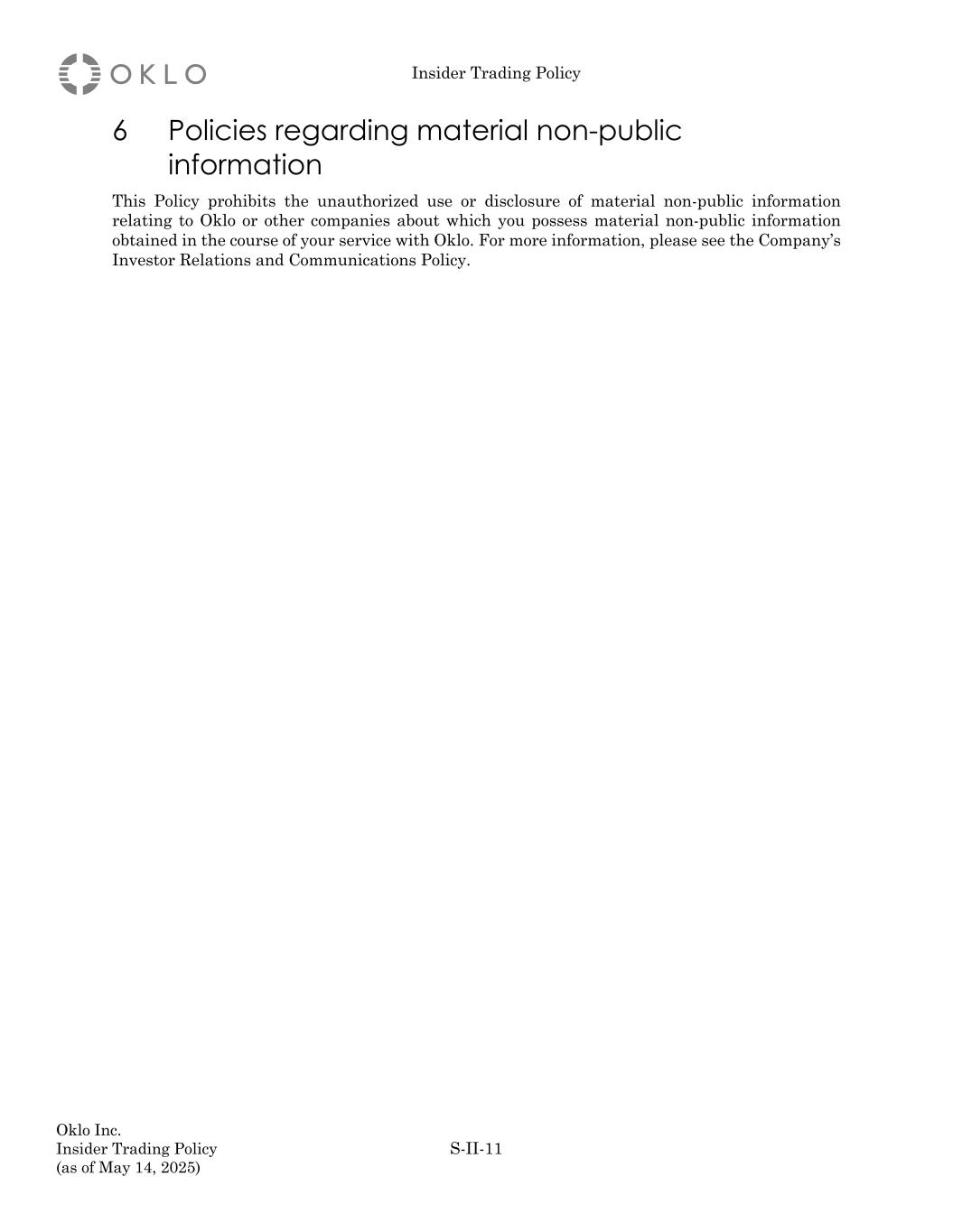 Oklo Inc. Insider Trading Policy (as of May 14, 2025) S-II-11 Insider Trading Policy 6 Policies regarding material non-public information This Policy prohibits the unauthorized use or disclosure of material non-public information relating to Oklo or other companies about which you possess material non-public information obtained in the course of your service with Oklo. For more information, please see the Company’s Investor Relations and Communications Policy.