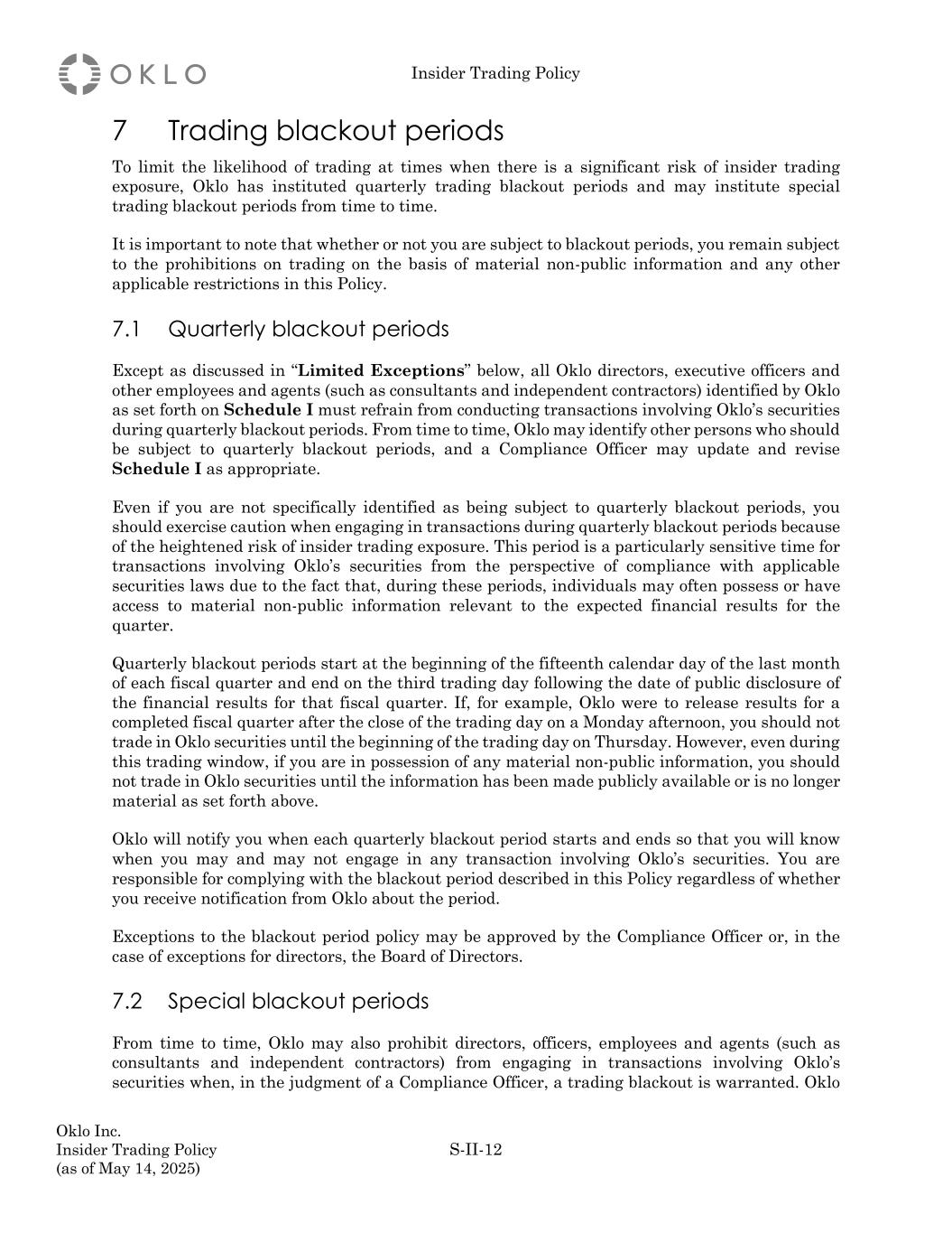 Oklo Inc. Insider Trading Policy (as of May 14, 2025) S-II-12 Insider Trading Policy 7 Trading blackout periods To limit the likelihood of trading at times when there is a significant risk of insider trading exposure, Oklo has instituted quarterly trading blackout periods and may institute special trading blackout periods from time to time. It is important to note that whether or not you are subject to blackout periods, you remain subject to the prohibitions on trading on the basis of material non-public information and any other applicable restrictions in this Policy. 7.1 Quarterly blackout periods Except as discussed in “Limited Exceptions” below, all Oklo directors, executive officers and other employees and agents (such as consultants and independent contractors) identified by Oklo as set forth on Schedule I must refrain from conducting transactions involving Oklo’s securities during quarterly blackout periods. From time to time, Oklo may identify other persons who should be subject to quarterly blackout periods, and a Compliance Officer may update and revise Schedule I as appropriate. Even if you are not specifically identified as being subject to quarterly blackout periods, you should exercise caution when engaging in transactions during quarterly blackout periods because of the heightened risk of insider trading exposure. This period is a particularly sensitive time for transactions involving Oklo’s securities from the perspective of compliance with applicable securities laws due to the fact that, during these periods, individuals may often possess or have access to material non-public information relevant to the expected financial results for the quarter. Quarterly blackout periods start at the beginning of the fifteenth calendar day of the last month of each fiscal quarter and end on the third trading day following the date of public disclosure of the financial results for that fiscal quarter. If, for example, Oklo were to release results for a completed fiscal quarter after the close of the trading day on a Monday afternoon, you should not trade in Oklo securities until the beginning of the trading day on Thursday. However, even during this trading window, if you are in possession of any material non-public information, you should not trade in Oklo securities until the information has been made publicly available or is no longer material as set forth above. Oklo will notify you when each quarterly blackout period starts and ends so that you will know when you may and may not engage in any transaction involving Oklo’s securities. You are responsible for complying with the blackout period described in this Policy regardless of whether you receive notification from Oklo about the period. Exceptions to the blackout period policy may be approved by the Compliance Officer or, in the case of exceptions for directors, the Board of Directors. 7.2 Special blackout periods From time to time, Oklo may also prohibit directors, officers, employees and agents (such as consultants and independent contractors) from engaging in transactions involving Oklo’s securities when, in the judgment of a Compliance Officer, a trading blackout is warranted. Oklo