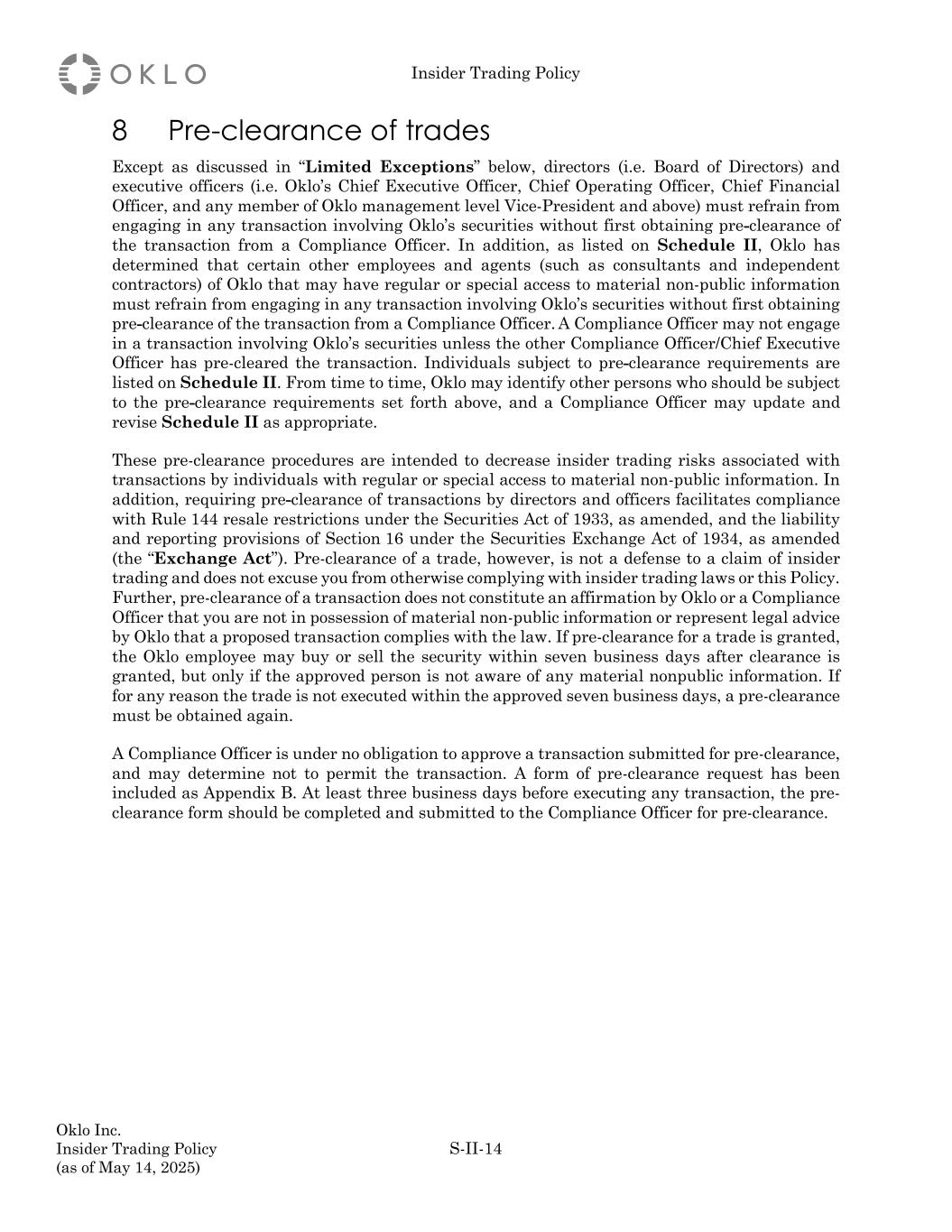 Oklo Inc. Insider Trading Policy (as of May 14, 2025) S-II-14 Insider Trading Policy 8 Pre-clearance of trades Except as discussed in “Limited Exceptions” below, directors (i.e. Board of Directors) and executive officers (i.e. Oklo’s Chief Executive Officer, Chief Operating Officer, Chief Financial Officer, and any member of Oklo management level Vice-President and above) must refrain from engaging in any transaction involving Oklo’s securities without first obtaining pre-clearance of the transaction from a Compliance Officer. In addition, as listed on Schedule II, Oklo has determined that certain other employees and agents (such as consultants and independent contractors) of Oklo that may have regular or special access to material non-public information must refrain from engaging in any transaction involving Oklo’s securities without first obtaining pre-clearance of the transaction from a Compliance Officer. A Compliance Officer may not engage in a transaction involving Oklo’s securities unless the other Compliance Officer/Chief Executive Officer has pre-cleared the transaction. Individuals subject to pre-clearance requirements are listed on Schedule II. From time to time, Oklo may identify other persons who should be subject to the pre-clearance requirements set forth above, and a Compliance Officer may update and revise Schedule II as appropriate. These pre-clearance procedures are intended to decrease insider trading risks associated with transactions by individuals with regular or special access to material non-public information. In addition, requiring pre-clearance of transactions by directors and officers facilitates compliance with Rule 144 resale restrictions under the Securities Act of 1933, as amended, and the liability and reporting provisions of Section 16 under the Securities Exchange Act of 1934, as amended (the “Exchange Act”). Pre-clearance of a trade, however, is not a defense to a claim of insider trading and does not excuse you from otherwise complying with insider trading laws or this Policy. Further, pre-clearance of a transaction does not constitute an affirmation by Oklo or a Compliance Officer that you are not in possession of material non-public information or represent legal advice by Oklo that a proposed transaction complies with the law. If pre-clearance for a trade is granted, the Oklo employee may buy or sell the security within seven business days after clearance is granted, but only if the approved person is not aware of any material nonpublic information. If for any reason the trade is not executed within the approved seven business days, a pre-clearance must be obtained again. A Compliance Officer is under no obligation to approve a transaction submitted for pre-clearance, and may determine not to permit the transaction. A form of pre-clearance request has been included as Appendix B. At least three business days before executing any transaction, the pre- clearance form should be completed and submitted to the Compliance Officer for pre-clearance.