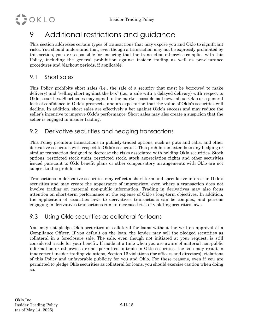 Oklo Inc. Insider Trading Policy (as of May 14, 2025) S-II-15 Insider Trading Policy 9 Additional restrictions and guidance This section addresses certain types of transactions that may expose you and Oklo to significant risks. You should understand that, even though a transaction may not be expressly prohibited by this section, you are responsible for ensuring that the transaction otherwise complies with this Policy, including the general prohibition against insider trading as well as pre-clearance procedures and blackout periods, if applicable. 9.1 Short sales This Policy prohibits short sales (i.e., the sale of a security that must be borrowed to make delivery) and “selling short against the box” (i.e., a sale with a delayed delivery) with respect to Oklo securities. Short sales may signal to the market possible bad news about Oklo or a general lack of confidence in Oklo’s prospects, and an expectation that the value of Oklo’s securities will decline. In addition, short sales are effectively a bet against Oklo’s success and may reduce the seller’s incentive to improve Oklo’s performance. Short sales may also create a suspicion that the seller is engaged in insider trading. 9.2 Derivative securities and hedging transactions This Policy prohibits transactions in publicly-traded options, such as puts and calls, and other derivative securities with respect to Oklo’s securities. This prohibition extends to any hedging or similar transaction designed to decrease the risks associated with holding Oklo securities. Stock options, restricted stock units, restricted stock, stock appreciation rights and other securities issued pursuant to Oklo benefit plans or other compensatory arrangements with Oklo are not subject to this prohibition. Transactions in derivative securities may reflect a short-term and speculative interest in Oklo’s securities and may create the appearance of impropriety, even where a transaction does not involve trading on material non-public information. Trading in derivatives may also focus attention on short-term performance at the expense of Oklo’s long-term objectives. In addition, the application of securities laws to derivatives transactions can be complex, and persons engaging in derivatives transactions run an increased risk of violating securities laws. 9.3 Using Oklo securities as collateral for loans You may not pledge Oklo securities as collateral for loans without the written approval of a Compliance Officer. If you default on the loan, the lender may sell the pledged securities as collateral in a foreclosure sale. The sale, even though not initiated at your request, is still considered a sale for your benefit. If made at a time when you are aware of material non-public information or otherwise are not permitted to trade in Oklo securities, the sale may result in inadvertent insider trading violations, Section 16 violations (for officers and directors), violations of this Policy and unfavorable publicity for you and Oklo. For these reasons, even if you are permitted to pledge Oklo securities as collateral for loans, you should exercise caution when doing so.