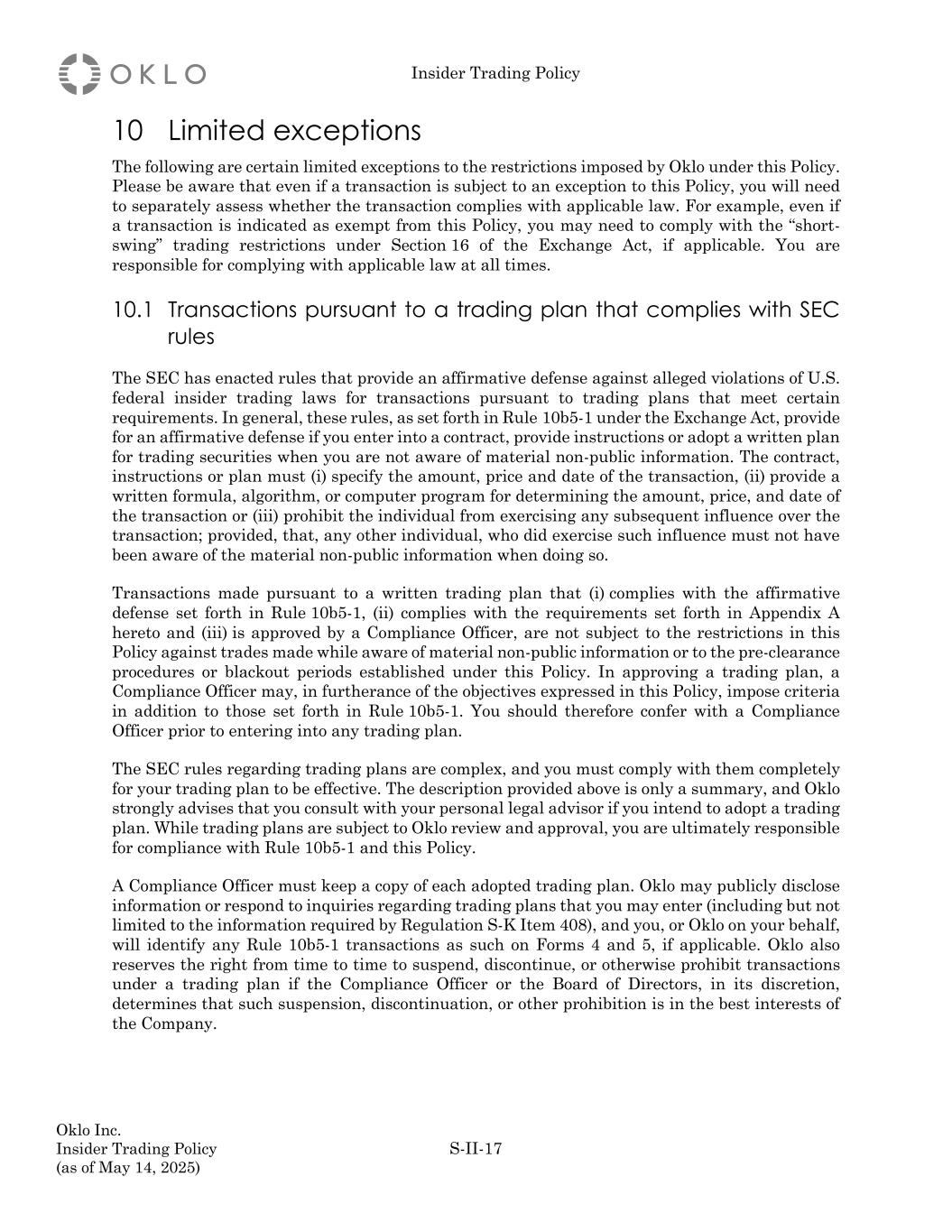 Oklo Inc. Insider Trading Policy (as of May 14, 2025) S-II-17 Insider Trading Policy 10 Limited exceptions The following are certain limited exceptions to the restrictions imposed by Oklo under this Policy. Please be aware that even if a transaction is subject to an exception to this Policy, you will need to separately assess whether the transaction complies with applicable law. For example, even if a transaction is indicated as exempt from this Policy, you may need to comply with the “short- swing” trading restrictions under Section 16 of the Exchange Act, if applicable. You are responsible for complying with applicable law at all times. 10.1 Transactions pursuant to a trading plan that complies with SEC rules The SEC has enacted rules that provide an affirmative defense against alleged violations of U.S. federal insider trading laws for transactions pursuant to trading plans that meet certain requirements. In general, these rules, as set forth in Rule 10b5-1 under the Exchange Act, provide for an affirmative defense if you enter into a contract, provide instructions or adopt a written plan for trading securities when you are not aware of material non-public information. The contract, instructions or plan must (i) specify the amount, price and date of the transaction, (ii) provide a written formula, algorithm, or computer program for determining the amount, price, and date of the transaction or (iii) prohibit the individual from exercising any subsequent influence over the transaction; provided, that, any other individual, who did exercise such influence must not have been aware of the material non-public information when doing so. Transactions made pursuant to a written trading plan that (i) complies with the affirmative defense set forth in Rule 10b5-1, (ii) complies with the requirements set forth in Appendix A hereto and (iii) is approved by a Compliance Officer, are not subject to the restrictions in this Policy against trades made while aware of material non-public information or to the pre-clearance procedures or blackout periods established under this Policy. In approving a trading plan, a Compliance Officer may, in furtherance of the objectives expressed in this Policy, impose criteria in addition to those set forth in Rule 10b5-1. You should therefore confer with a Compliance Officer prior to entering into any trading plan. The SEC rules regarding trading plans are complex, and you must comply with them completely for your trading plan to be effective. The description provided above is only a summary, and Oklo strongly advises that you consult with your personal legal advisor if you intend to adopt a trading plan. While trading plans are subject to Oklo review and approval, you are ultimately responsible for compliance with Rule 10b5-1 and this Policy. A Compliance Officer must keep a copy of each adopted trading plan. Oklo may publicly disclose information or respond to inquiries regarding trading plans that you may enter (including but not limited to the information required by Regulation S-K Item 408), and you, or Oklo on your behalf, will identify any Rule 10b5-1 transactions as such on Forms 4 and 5, if applicable. Oklo also reserves the right from time to time to suspend, discontinue, or otherwise prohibit transactions under a trading plan if the Compliance Officer or the Board of Directors, in its discretion, determines that such suspension, discontinuation, or other prohibition is in the best interests of the Company.