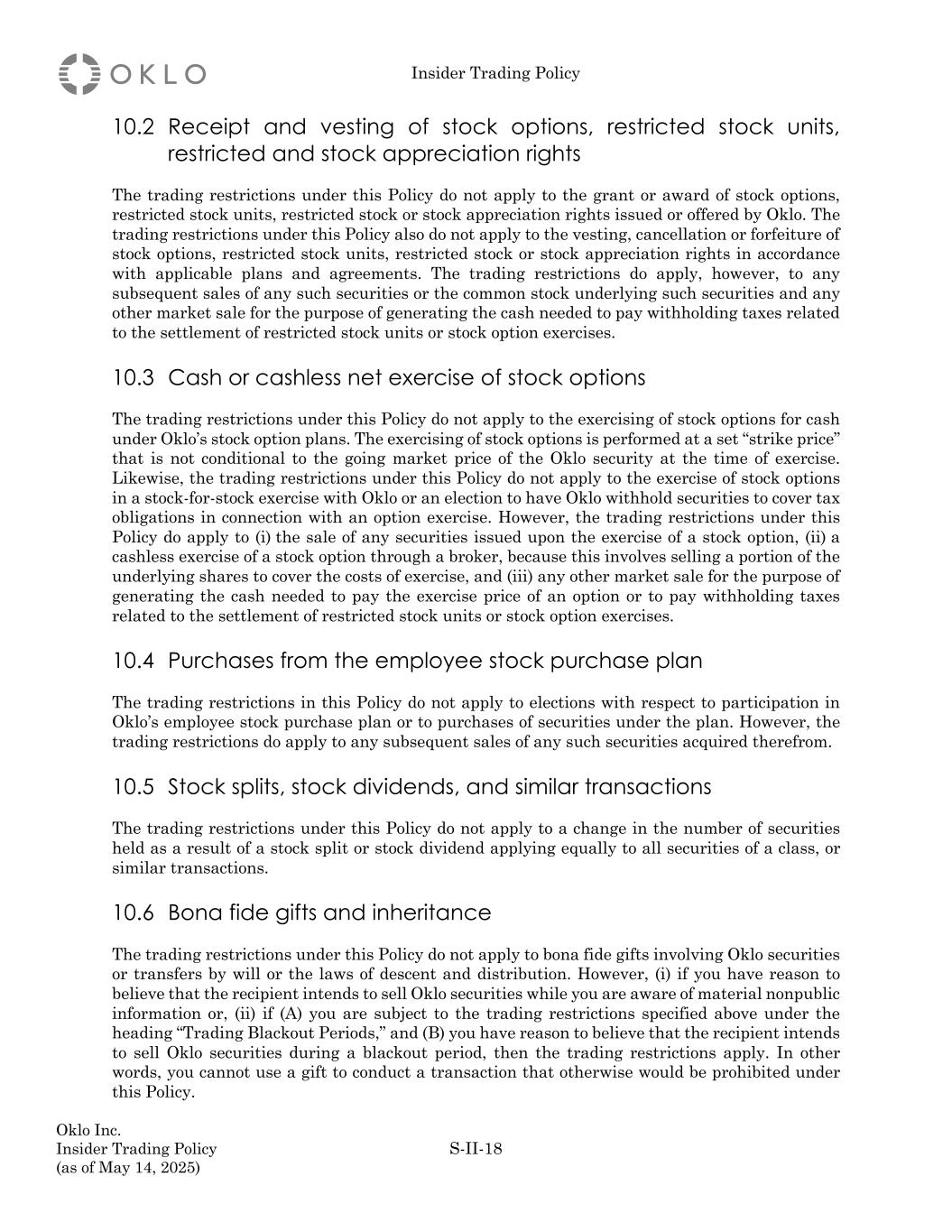 Oklo Inc. Insider Trading Policy (as of May 14, 2025) S-II-18 Insider Trading Policy 10.2 Receipt and vesting of stock options, restricted stock units, restricted and stock appreciation rights The trading restrictions under this Policy do not apply to the grant or award of stock options, restricted stock units, restricted stock or stock appreciation rights issued or offered by Oklo. The trading restrictions under this Policy also do not apply to the vesting, cancellation or forfeiture of stock options, restricted stock units, restricted stock or stock appreciation rights in accordance with applicable plans and agreements. The trading restrictions do apply, however, to any subsequent sales of any such securities or the common stock underlying such securities and any other market sale for the purpose of generating the cash needed to pay withholding taxes related to the settlement of restricted stock units or stock option exercises. 10.3 Cash or cashless net exercise of stock options The trading restrictions under this Policy do not apply to the exercising of stock options for cash under Oklo’s stock option plans. The exercising of stock options is performed at a set “strike price” that is not conditional to the going market price of the Oklo security at the time of exercise. Likewise, the trading restrictions under this Policy do not apply to the exercise of stock options in a stock-for-stock exercise with Oklo or an election to have Oklo withhold securities to cover tax obligations in connection with an option exercise. However, the trading restrictions under this Policy do apply to (i) the sale of any securities issued upon the exercise of a stock option, (ii) a cashless exercise of a stock option through a broker, because this involves selling a portion of the underlying shares to cover the costs of exercise, and (iii) any other market sale for the purpose of generating the cash needed to pay the exercise price of an option or to pay withholding taxes related to the settlement of restricted stock units or stock option exercises. 10.4 Purchases from the employee stock purchase plan The trading restrictions in this Policy do not apply to elections with respect to participation in Oklo’s employee stock purchase plan or to purchases of securities under the plan. However, the trading restrictions do apply to any subsequent sales of any such securities acquired therefrom. 10.5 Stock splits, stock dividends, and similar transactions The trading restrictions under this Policy do not apply to a change in the number of securities held as a result of a stock split or stock dividend applying equally to all securities of a class, or similar transactions. 10.6 Bona fide gifts and inheritance The trading restrictions under this Policy do not apply to bona fide gifts involving Oklo securities or transfers by will or the laws of descent and distribution. However, (i) if you have reason to believe that the recipient intends to sell Oklo securities while you are aware of material nonpublic information or, (ii) if (A) you are subject to the trading restrictions specified above under the heading “Trading Blackout Periods,” and (B) you have reason to believe that the recipient intends to sell Oklo securities during a blackout period, then the trading restrictions apply. In other words, you cannot use a gift to conduct a transaction that otherwise would be prohibited under this Policy.