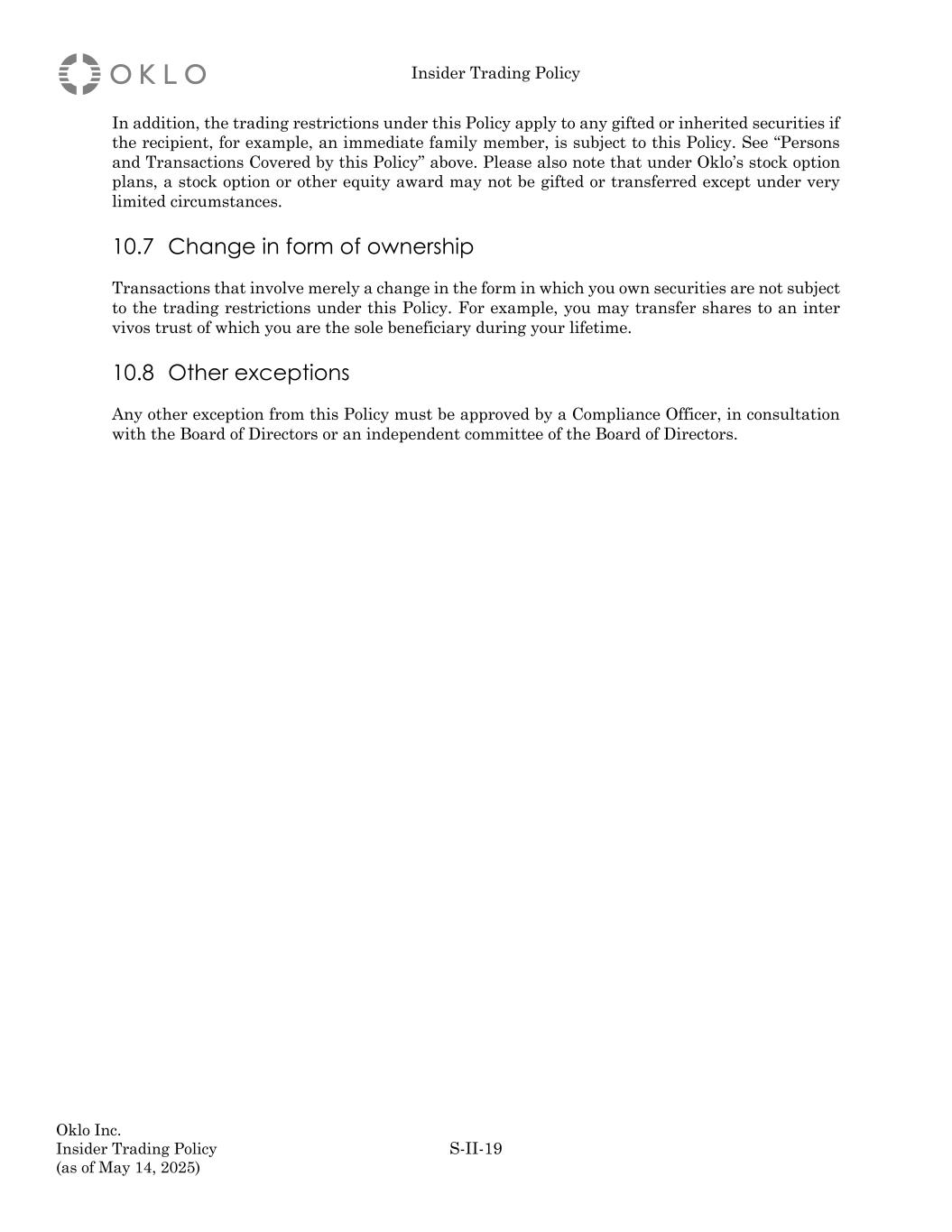 Oklo Inc. Insider Trading Policy (as of May 14, 2025) S-II-19 Insider Trading Policy In addition, the trading restrictions under this Policy apply to any gifted or inherited securities if the recipient, for example, an immediate family member, is subject to this Policy. See “Persons and Transactions Covered by this Policy” above. Please also note that under Oklo’s stock option plans, a stock option or other equity award may not be gifted or transferred except under very limited circumstances. 10.7 Change in form of ownership Transactions that involve merely a change in the form in which you own securities are not subject to the trading restrictions under this Policy. For example, you may transfer shares to an inter vivos trust of which you are the sole beneficiary during your lifetime. 10.8 Other exceptions Any other exception from this Policy must be approved by a Compliance Officer, in consultation with the Board of Directors or an independent committee of the Board of Directors.