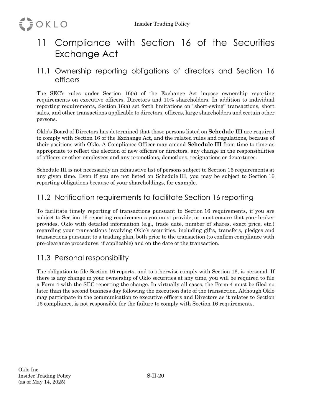 Oklo Inc. Insider Trading Policy (as of May 14, 2025) S-II-20 Insider Trading Policy 11 Compliance with Section 16 of the Securities Exchange Act 11.1 Ownership reporting obligations of directors and Section 16 officers The SEC’s rules under Section 16(a) of the Exchange Act impose ownership reporting requirements on executive officers, Directors and 10% shareholders. In addition to individual reporting requirements, Section 16(a) set forth limitations on “short-swing” transactions, short sales, and other transactions applicable to directors, officers, large shareholders and certain other persons. Oklo’s Board of Directors has determined that those persons listed on Schedule III are required to comply with Section 16 of the Exchange Act, and the related rules and regulations, because of their positions with Oklo. A Compliance Officer may amend Schedule III from time to time as appropriate to reflect the election of new officers or directors, any change in the responsibilities of officers or other employees and any promotions, demotions, resignations or departures. Schedule III is not necessarily an exhaustive list of persons subject to Section 16 requirements at any given time. Even if you are not listed on Schedule III, you may be subject to Section 16 reporting obligations because of your shareholdings, for example. 11.2 Notification requirements to facilitate Section 16 reporting To facilitate timely reporting of transactions pursuant to Section 16 requirements, if you are subject to Section 16 reporting requirements you must provide, or must ensure that your broker provides, Oklo with detailed information (e.g., trade date, number of shares, exact price, etc.) regarding your transactions involving Oklo’s securities, including gifts, transfers, pledges and transactions pursuant to a trading plan, both prior to the transaction (to confirm compliance with pre-clearance procedures, if applicable) and on the date of the transaction. 11.3 Personal responsibility The obligation to file Section 16 reports, and to otherwise comply with Section 16, is personal. If there is any change in your ownership of Oklo securities at any time, you will be required to file a Form 4 with the SEC reporting the change. In virtually all cases, the Form 4 must be filed no later than the second business day following the execution date of the transaction. Although Oklo may participate in the communication to executive officers and Directors as it relates to Section 16 compliance, is not responsible for the failure to comply with Section 16 requirements.