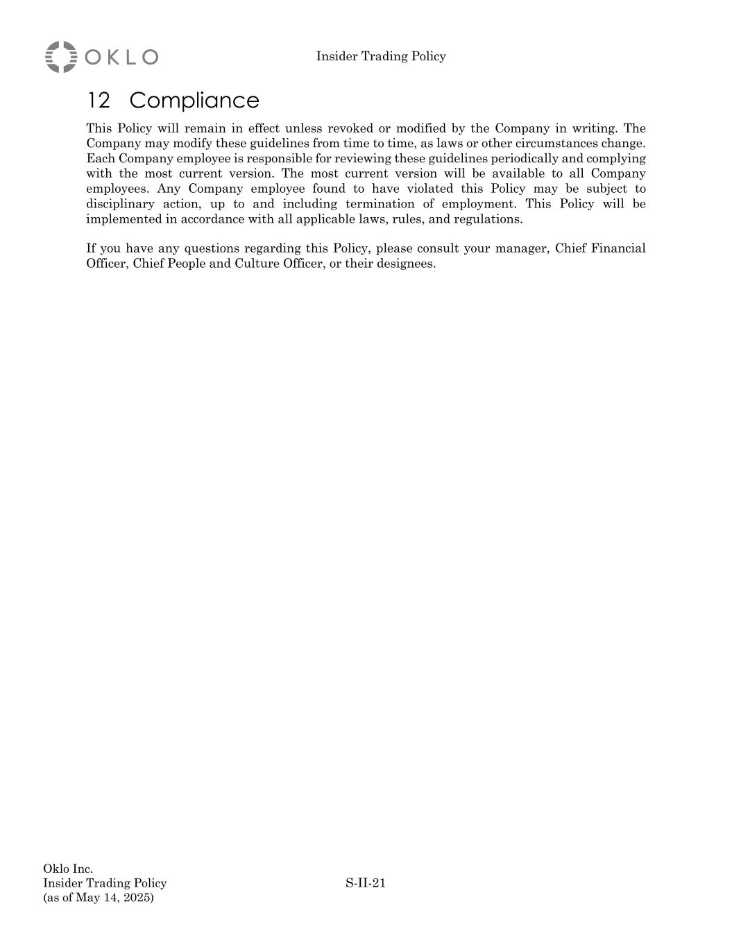 Oklo Inc. Insider Trading Policy (as of May 14, 2025) S-II-21 Insider Trading Policy 12 Compliance This Policy will remain in effect unless revoked or modified by the Company in writing. The Company may modify these guidelines from time to time, as laws or other circumstances change. Each Company employee is responsible for reviewing these guidelines periodically and complying with the most current version. The most current version will be available to all Company employees. Any Company employee found to have violated this Policy may be subject to disciplinary action, up to and including termination of employment. This Policy will be implemented in accordance with all applicable laws, rules, and regulations. If you have any questions regarding this Policy, please consult your manager, Chief Financial Officer, Chief People and Culture Officer, or their designees.